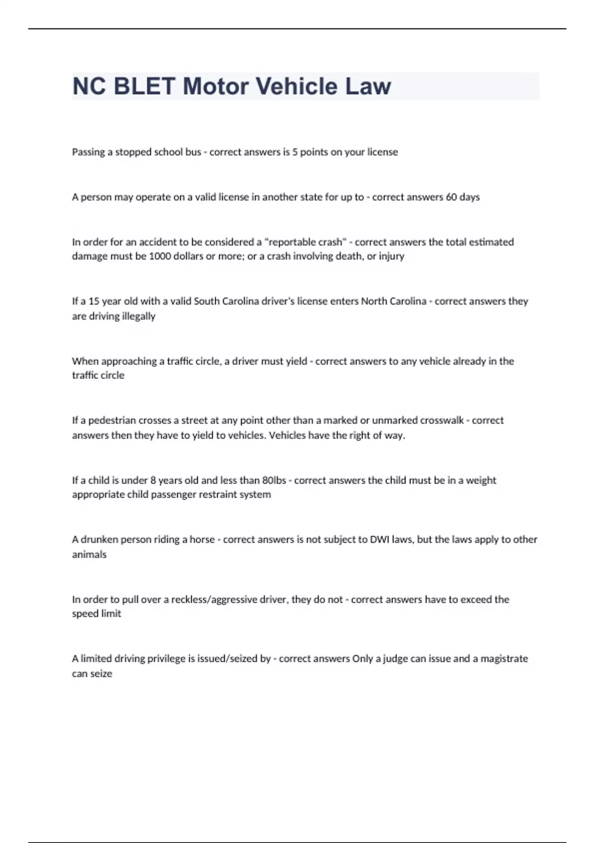 NC BLET Motor Vehicle LawPassing a stopped school bus - correct answers is 5 points on your license A person may operate on a valid license in another state for up to - correct answers 60 days In order for an accident to be considered a "reportable crash" - correct answers the total estimated damage must be 1000 dollars or more; or a crash involving death, or injury If a 15 year old with a valid South Carolina driver's license enters North Carolina - correct answers they are driving illegally When approaching a traffic circle, a driver must yield - correct answers to any vehicle already in the traffic circle If a pedestrian crosses a street at any point other than a marked or unmarked crosswalk - correct answers then they have to yield to vehicles. Vehicles have the right of way. If a child is under 8 years old and less than 80lbs - correct answers the child must be in a weight appropriate child passenger restraint system A drunken person riding a horse - correct answers is not subject to DWI laws, but the laws apply to other animals In order to pull over a reckless/aggressive driver, they do not - correct answers have to exceed the speed limit A limited driving privilege is issued/seized by - correct answers Only a judge can issue and a magistrate can seize The most serious speed related offense - correct answers is fleeing to elude law enforcement It is illegal to operate a cell phone while driving if you are - correct answers under 18 years old An operator - correct answers is a person in actual physical control of a vehicle which is in motion or which has the engine running Is a mobility enhancement device a "vehicle" - correct answers No it is not. It is suitable for use indoors and outdoors, and is limited by design to under 15 mph Conditions in which a moped is actually a motorcycle - correct answers If it has over 50 cc. If it can run at over 30 mph on a flat stretch of road. If it has an external shifting device. "Highway" and "street" - correct answers are synonymous A driver's license is considered - correct answers any temporary or learners permit; the privilege of any person to drive a motor vehicle whether or not such person holds a valid license; and any non-resident's operating privilege. PVA - correct answers Public Vehicular Area A "resident" - correct answers is any person who resides within this state for other than a temporary or transitory purpose for more than six months shall be presumed to be. If you have a limited learner's permit - correct answers you must have a supervising driver in the front seat have permit in possession no other person in front seat first six months is 5 am to 9 pm only all people in vehicle must be in seatbelts shall not use a mobile phone while operating