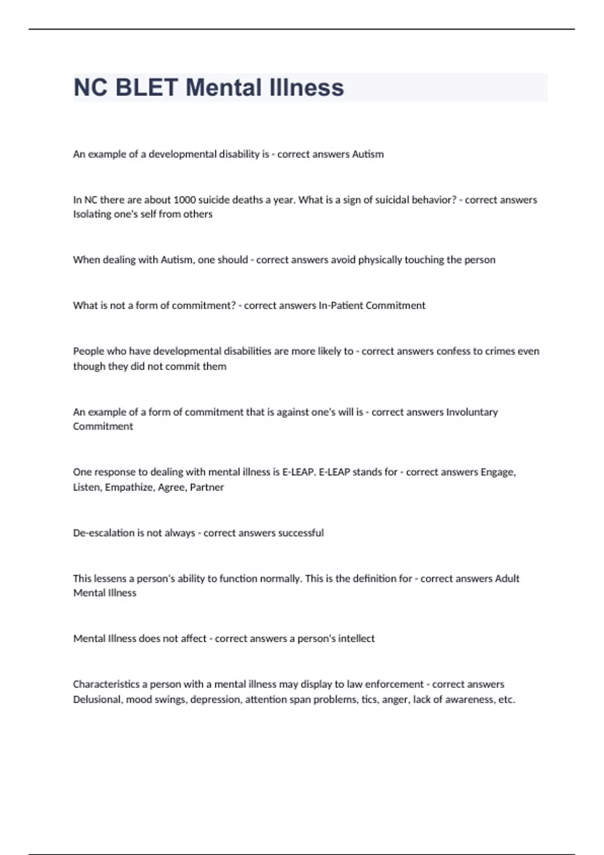 NC BLET Mental IllnessAn example of a developmental disability is - correct answers Autism In NC there are about 1000 suicide deaths a year. What is a sign of suicidal behavior? - correct answers Isolating one's self from others When dealing with Autism, one should - correct answers avoid physically touching the person What is not a form of commitment? - correct answers In-Patient Commitment People who have developmental disabilities are more likely to - correct answers confess to crimes even though they did not commit them An example of a form of commitment that is against one's will is - correct answers Involuntary Commitment One response to dealing with mental illness is E-LEAP. E-LEAP stands for - correct answers Engage, Listen, Empathize, Agree, Partner De-escalation is not always - correct answers successful This lessens a person's ability to function normally. This is the definition for - correct answers Adult Mental Illness Mental Illness does not affect - correct answers a person's intellect Characteristics a person with a mental illness may display to law enforcement - correct answers Delusional, mood swings, depression, attention span problems, tics, anger, lack of awareness, etc. Warning signs for suicide - correct answers Someone actively talks about attempting it, depression, getting affairs in order, no longer engaging in activities enjoyed, hopeless, etc. When is it appropriate to seek an involuntary commitment order? - correct answers When a subject is violent, and presents a danger to themselves or others. Local mental health resources - correct answers Mobile crisis teams, state facilities, Crisis hotline, etc. Some effective responses to individuals with a mental illness - correct answers E-LEAP, assertive intervention, non-verbal de-escalation, verbal de-escalation Voluntary Commitment - correct answers is the act or practice of a person admitting his/herself to a psychiatric hospital, or other mental health facility. Involuntary Commitment - correct answers a legal process through which an individual with symptoms of severe mental illness is court-ordered into treatment in a psychiatric hospital (inpatient) or in the community (outpatient). The patient is deemed a danger to his/herself or others.