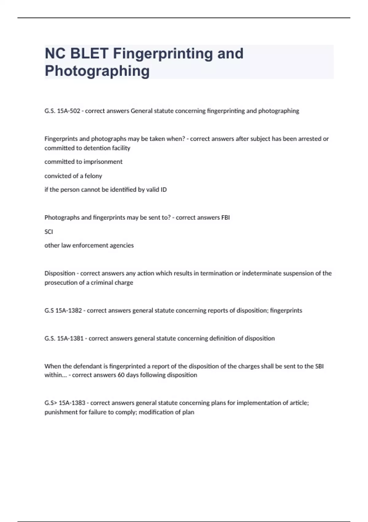 NC BLET Fingerprinting and PhotographingG.S. 15A-502 - correct answers General statute concerning fingerprinting and photographing Fingerprints and photographs may be taken when? - correct answers after subject has been arrested or committed to detention facility committed to imprisonment convicted of a felony if the person cannot be identified by valid ID Photographs and fingerprints may be sent to? - correct answers FBI SCI other law enforcement agencies Disposition - correct answers any action which results in termination or indeterminate suspension of the prosecution of a criminal charge G.S 15A-1382 - correct answers general statute concerning reports of disposition; fingerprints G.S. 15A-1381 - correct answers general statute concerning definition of disposition When the defendant is fingerprinted a report of the disposition of the charges shall be sent to the SBI within... - correct answers 60 days following disposition G.S> 15A-1383 - correct answers general statute concerning plans for implementation of article; punishment for failure to comply; modification of plan Who has the authority to develop a plan to ensure that the agencies within a district submit fingerprints and information about dispositions of criminal matters to the SBI? - correct answers Senior resident Superior Court Judges G.S. 7B-2200 - correct answers general statute concerning the transfer of jurisdiction of juvenile to superior court. -a district court, after finding probable cause, may transfer jurisdiction over a juvenile to superior court if the juvenile allegedly committed the offense of a felony G.S. 7B-2201 - correct answers fingerprinting juvenile transferred to superior court. -when jurisdiction over a juvenile is transferred to the superior court, the juvenile shall be fingerprinted and his prints sent to the SBI Under G.S. 7B-2102, a law enforcement officer or agency must fingerprint and photograph a juvenile when: - correct answers - The LEO has prepared a complaint for filing as a petition - The complaint charges one of more nondivertible offenses - The juvenile was at least ten years old at the time the offense was committed - The juvenile is in the physical custody of law enforcement or the DJJ and Delinquency Prevention. When will a juvenile's fingerprints and photographs be destroyed? - correct answers -intake counselor or prosecutor does not file a petition within one year of prints and photos being taken -the court does not find probable cause -juvenile is not adjudicated delinquent of any offense that could be a felony or misdemeanor undisciplined juvenile - correct answers a person under 18 who is regularly disobedient to and beyond the disciplinary control of his parent, guardian, or custodian, or is regularly found in places where it is unlawful for a juvenile to be, or who has run away from home for a period of more than 24 hours "undisciplined" 16 and 17 year olds who are taken into custody ____________ - correct answers cannot be fingerprinted
