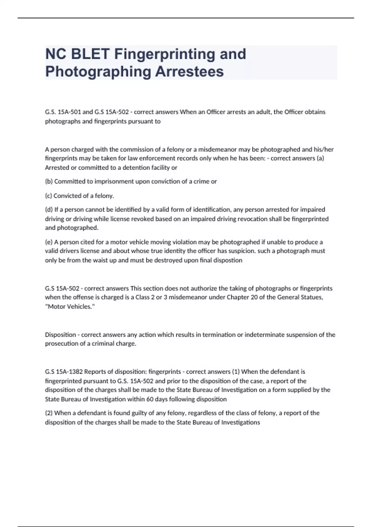 NC BLET Fingerprinting and Photographing ArresteesG.S. 15A-501 and G.S 15A-502 - correct answers When an Officer arrests an adult, the Officer obtains photographs and fingerprints pursuant to A person charged with the commission of a felony or a misdemeanor may be photographed and his/her fingerprints may be taken for law enforcement records only when he has been: - correct answers (a) Arrested or committed to a detention facility or (b) Committed to imprisonment upon conviction of a crime or (c) Convicted of a felony. (d) If a person cannot be identified by a valid form of identification, any person arrested for impaired driving or driving while license revoked based on an impaired driving revocation shall be fingerprinted and photographed. (e) A person cited for a motor vehicle moving violation may be photographed if unable to produce a valid drivers license and about whose true identity the officer has suspicion. such a photograph must only be from the waist up and must be destroyed upon final dispostion G.S 15A-502 - correct answers This section does not authorize the taking of photographs or fingerprints when the offense is charged is a Class 2 or 3 misdemeanor under Chapter 20 of the General Statues, "Motor Vehicles." Disposition - correct answers any action which results in termination or indeterminate suspension of the prosecution of a criminal charge. G.S 15A-1382 Reports of disposition: fingerprints - correct answers (1) When the defendant is fingerprinted pursuant to G.S. 15A-502 and prior to the disposition of the case, a report of the disposition of the charges shall be made to the State Bureau of Investigation on a form supplied by the State Bureau of Investigation within 60 days following disposition (2) When a defendant is found guilty of any felony, regardless of the class of felony, a report of the disposition of the charges shall be made to the State Bureau of Investigations G.S. 7B-2200 - correct answers Transfer of jurisdiction of juvenile to superior court. A district court after notice, hearing and a finding of probale cause may transfer jurisdiction over a juvenile to superior court if the juvenile was 13 years of age or older at the time the juvenile allegedly committed an offense that would be a felony if committed by an adult. If the alleged felony constitutes a Class A felony and the district court finds probable cause, the court shall transfer the case to the superior court for trial as in the case of adults. G.S. 7B-2201 - correct answers Fingerprinting juvenile transferred to superior court. When jurisdiction over a juvenile is transferred to the superior court, the juvenile shall be fingerprinted and his/her fingerprints shall be sen to the State Bureau of Investigation. G.S. 7B-2102 - correct answers A law enforcement officer or agency must fingerprint and photograph a juvenile when: (a) The law enforcement officer has prepared a complaint for filing as a petition and (b) The complaint charges one of more nondivertible offenses as set forth in G.S. 7B-1701 and (c) The juvenile was at least ten years old at the time the offense was committed and (d) The juvenile is in the phsical custody of law enforcement or the Department of Juvenile Justice and Deliquency Prevention. This statue gives the right to take the fingerprints If law enforcement cannot or does not take fingerprints or photographs of a juvenile under the above section or the prints have been destroyed, the officer must fingerprint and photograph a juvenile: - correct answers (a) Who has been adjudicated delinquent and (b) Who is 10 years old or older at the time of the commission of the offense and (c) The juvenile has been adjudicated delinquent for conduct which would be a felony if committed by an adult. Other than this electronic file, fingerprints and photographs must be maintained separately from any juvenile record. They are not public records and must be withheld from inspection and are not to be