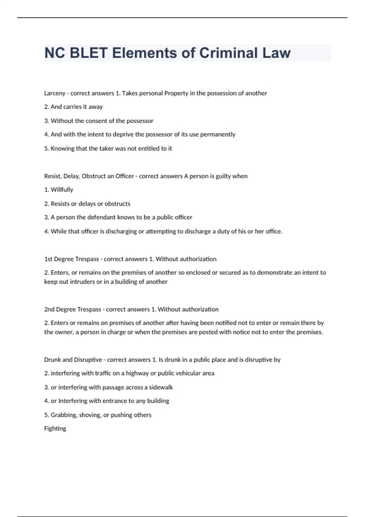 NC BLET Elements of Criminal Law question n answers graded A+ 2023/2024