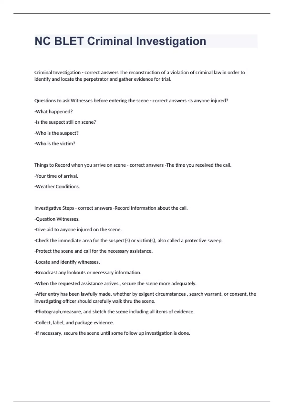 NC BLET Criminal InvestigationCriminal Investigation - correct answers The reconstruction of a violation of criminal law in order to identify and locate the perpetrator and gather evidence for trial. Questions to ask Witnesses before entering the scene - correct answers -Is anyone injured? -What happened? -Is the suspect still on scene? -Who is the suspect? -Who is the victim? Things to Record when you arrive on scene - correct answers -The time you received the call. -Your time of arrival. -Weather Conditions. Investigative Steps - correct answers -Record Information about the call. -Question Witnesses. -Give aid to anyone injured on the scene. -Check the immediate area for the suspect(s) or victim(s), also called a protective sweep. -Protect the scene and call for the necessary assistance. -Locate and identify witnesses. -Broadcast any lookouts or necessary information. -When the requested assistance arrives , secure the scene more adequately. -After entry has been lawfully made, whether by exigent circumstances , search warrant, or consent, the investigating officer should carefully walk thru the scene. -Photograph,measure, and sketch the scene including all items of evidence. -Collect, label, and package evidence. -If necessary, secure the scene until some follow up investigation is done. Two Reasons for Preservation of the Crime Scene - correct answers -To prevent the destruction or removal of physical evidence AND -To allow for accurate reconstruction of the events occurring at the scene. Preservation starts by removing____________________________________________ from the area. - correct answers Unauthorized Persons Methods for securing the crime scene area - correct answers -Posting additional officers at entrance. -Roping off the involved area. -Placings signs on doors. -Positioning barricades to block streets. -Using traffic cones or flares to block areas or provide a guide for direction of travel. -Using patrol vehicles to block streets or a specific area. Seven Areas Common to most Crime Scenes - correct answers -Place of arrival -Point of entry -Path through the scene -Contact with the scene -Contact with the victim -Place of exit -Place of arrest Whenever possible, all evidence should be __________________until photographed and measured for the sketch. - correct answers Unmoved If anything is touched or moved- - correct answers -the officer must document that in their report and obtain elimination fingerprints and DNA from the party that moved or touched the item. Ways to Locate and Identify Potential Witnesses - correct answers -Conduct an area canvass to locate those that live or work near the crime scene. -Observe the individuals that are talking amongst themselves while others are listening. -Interview friends, relatives, and associates of victim. -Interview those named during the interviews with the above people. -Check your local department records division for associates to the victim and/or suspect. -Locate photographs found at the scene or in the victims possession, of possible associates. -Locate the victims address or phone book. -Seize surveillance film from the location of the crime and/or area surrounding businesses. -Recover cell phones and other devices which hold memory from the victim, suspect, and witnesses. Minimum Identification for People Interviewed - correct answers -Full Name -Sex, race, and date of birth -Home address and phone number -Business address and phone number -Cell Phone number(s) -E-mail Address -Next of kin or friend contact information When possible get a __________________________ statement from each witness. - correct answers Recorded(Video or audio) Statement - correct answers First-hand account of a crime as given to an investigating law enforcement officer. Purposes for obtaining a statement - correct answers -Provide a first hand account of what a victim, witness, and/or suspect say occurred. -Substantiate the charges against the suspect. -Impeach conflicting testimony of a witness or suspect in court. -Provide investigative information such as descriptions or identify of suspects and vehicles.