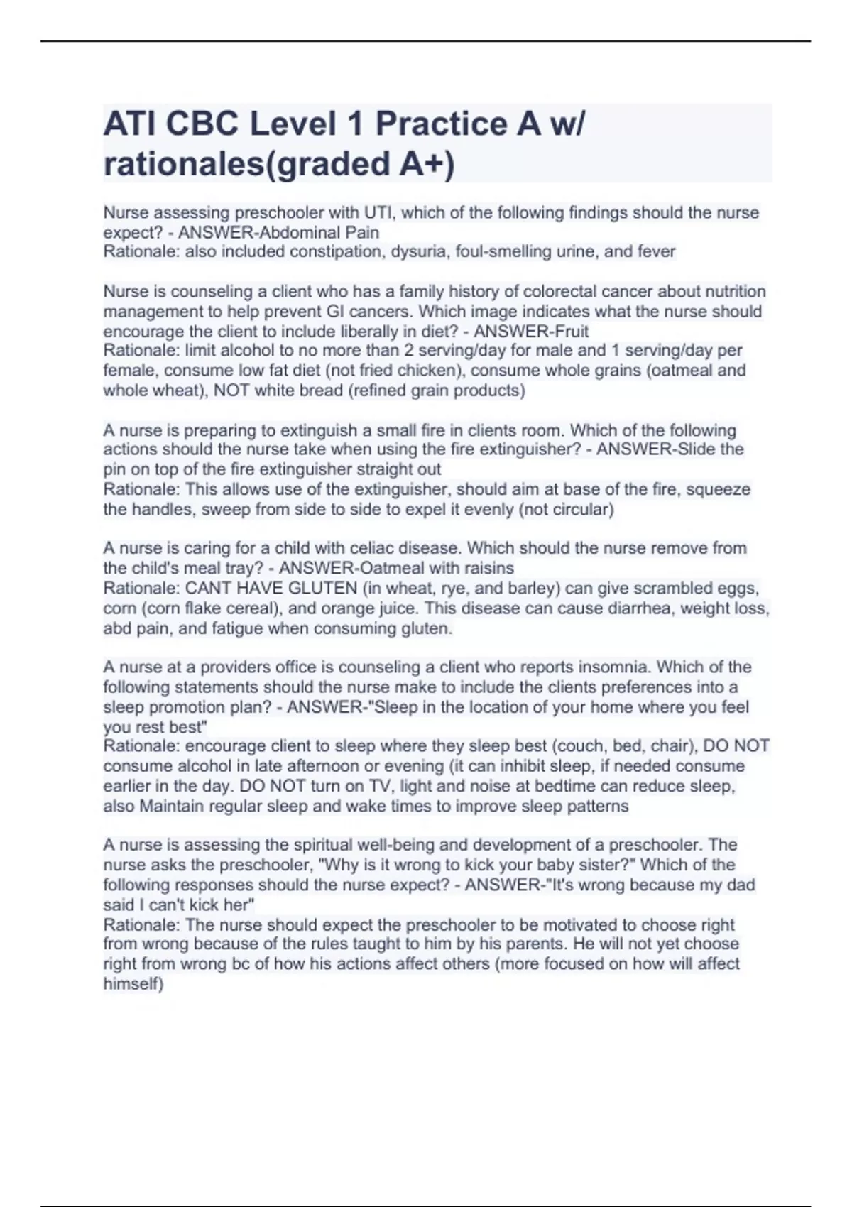 ATI CBC Level 1 Practice A w/ rationales(gradNurse assessing preschooler with UTI, which of the following findings should the nurse expect? - ANSWER-Abdominal Pain Rationale: also included constipation, dysuria, foul-smelling urine, and fever Nurse is counseling a client who has a family history of colorectal cancer about nutrition management to help prevent GI cancers. Which image indicates what the nurse should encourage the client to include liberally in diet? - ANSWER-Fruit Rationale: limit alcohol to no more than 2 serving/day for male and 1 serving/day per female, consume low fat diet (not fried chicken), consume whole grains (oatmeal and whole wheat), NOT white bread (refined grain products) A nurse is preparing to extinguish a small fire in clients room. Which of the following actions should the nurse take when using the fire extinguisher? - ANSWER-Slide the pin on top of the fire extinguisher straight out Rationale: This allows use of the extinguisher, should aim at base of the fire, squeeze the handles, sweep from side to side to expel it evenly (not circular) A nurse is caring for a child with celiac disease. Which should the nurse remove from the child's meal tray? - ANSWER-Oatmeal with raisins Rationale: CANT HAVE GLUTEN (in wheat, rye, and barley) can give scrambled eggs, corn (corn flake cereal), and orange juice. This disease can cause diarrhea, weight loss, abd pain, and fatigue when consuming gluten. A nurse at a providers office is counseling a client who reports insomnia. Which of the following statements should the nurse make to include the clients preferences into a sleep promotion plan? - ANSWER-"Sleep in the location of your home where you feel you rest best" Rationale: encourage client to sleep where they sleep best (couch, bed, chair), DO NOT consume alcohol in late afternoon or evening (it can inhibit sleep, if needed consume earlier in the day. DO NOT turn on TV, light and noise at bedtime can reduce sleep, also Maintain regular sleep and wake times to improve sleep patterns A nurse is assessing the spiritual well-being and development of a preschooler. The nurse asks the preschooler, "Why is it wrong to kick your baby sister?" Which of the following responses should the nurse expect? - ANSWER-"It's wrong because my dad said I can't kick her" Rationale: The nurse should expect the preschooler to be motivated to choose right from wrong because of the rules taught to him by his parents. He will not yet choose right from wrong bc of how his actions affect others (more focused on how will affect himself) ed A+)