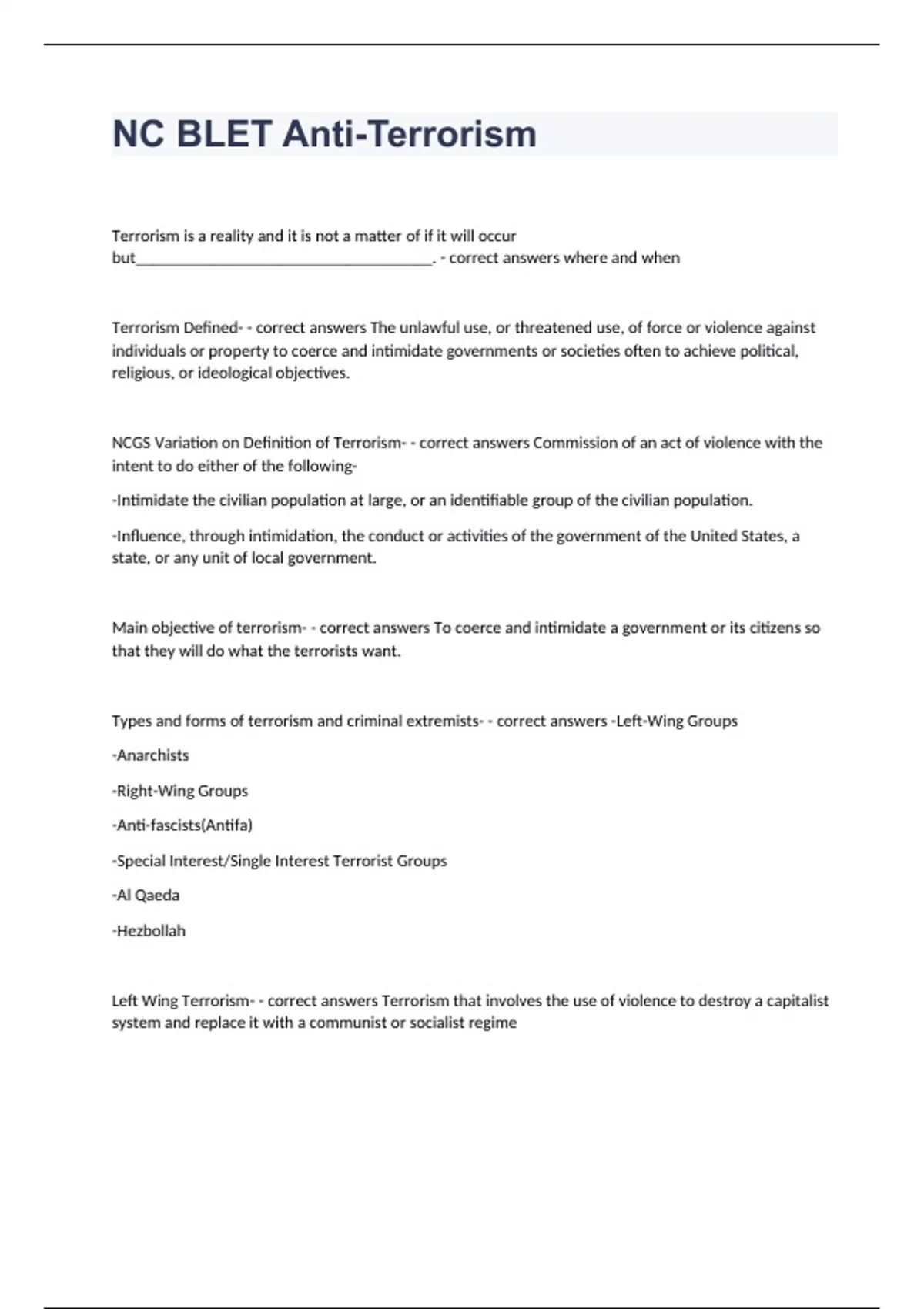 NC BLET Anti-Terrorism Terrorism is a reality and it is not a matter of if it will occur but___________________________________. - correct answers where and when Terrorism Defined- - correct answers The unlawful use, or threatened use, of force or violence against individuals or property to coerce and intimidate governments or societies often to achieve political, religious, or ideological objectives. NCGS Variation on Definition of Terrorism- - correct answers Commission of an act of violence with the intent to do either of the following- -Intimidate the civilian population at large, or an identifiable group of the civilian population. -Influence, through intimidation, the conduct or activities of the government of the United States, a state, or any unit of local government. Main objective of terrorism- - correct answers To coerce and intimidate a government or its citizens so that they will do what the terrorists want. Types and forms of terrorism and criminal extremists- - correct answers -Left-Wing Groups -Anarchists -Right-Wing Groups -Anti-fascists(Antifa) -Special Interest/Single Interest Terrorist Groups -Al Qaeda -Hezbollah Left Wing Terrorism- - correct answers Terrorism that involves the use of violence to destroy a capitalist system and replace it with a communist or socialist regime Anarchists Terrorism- - correct answers Pure, idealistic anarchists believe that there should not be any government and feel that each person should function separately, free of restraint. The terrorist group Weather Underground is an example of... - correct answers Left-wing terrorist group. Right-Wing terrorist Groups often adhere to.... - correct answers Racial supremacy, anti-government, anti-regulatory ideals. Special Interest/ Single Interest Terrorist Groups- - correct answers -"Earth First" -Ecological Resistance Movements -Animal Rights etc. Psychological Characteristics of Terrorists- - correct answers -Feel angry, alienated, or disenfranchised. -Believe that their current political involvement does not give them the power to effect real change. -Identify with perceived victims of the social injustice they are fighting. -Feel the need to take action rather than just talking about the problem. -Believe that engaging in violence against the state is not immoral. -Have friends or family sympathetic to the cause. Paper Terrorism- - correct answers The filing of false or frivolous civil suits to ensnare the court and its officers in its own procedures. This is NCGS 14-118.6-Filing False Lien or Encumbrance and it is a CLASS I FELONY. Sovereign Citizens - correct answers A loose network of individuals living in the United States who profess to believe that federal, state, and local governments operate illegally Islamic State of Iraq and Syria - correct answers ISIS Al-Qaeda Affiliate they promote militant Islamism. promoted a Islamic state and offered money and living for Islamic families willing to live there.