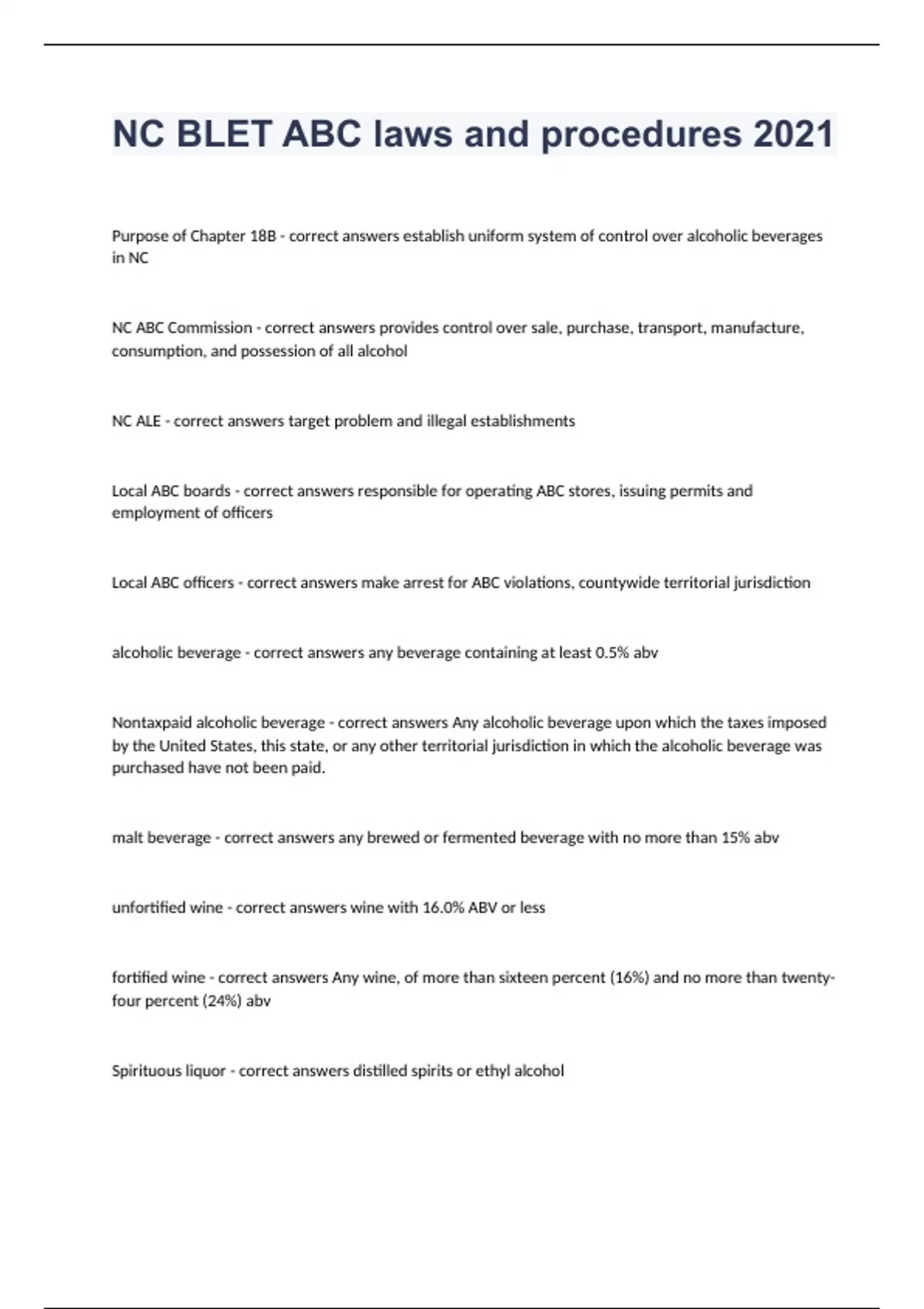 NC BLET ABC laws and procedures 2021Purpose of Chapter 18B - correct answers establish uniform system of control over alcoholic beverages in NC NC ABC Commission - correct answers provides control over sale, purchase, transport, manufacture, consumption, and possession of all alcohol NC ALE - correct answers target problem and illegal establishments Local ABC boards - correct answers responsible for operating ABC stores, issuing permits and employment of officers Local ABC officers - correct answers make arrest for ABC violations, countywide territorial jurisdiction alcoholic beverage - correct answers any beverage containing at least 0.5% abv Nontaxpaid alcoholic beverage - correct answers Any alcoholic beverage upon which the taxes imposed by the United States, this state, or any other territorial jurisdiction in which the alcoholic beverage was purchased have not been paid. malt beverage - correct answers any brewed or fermented beverage with no more than 15% abv unfortified wine - correct answers wine with 16.0% ABV or less fortified wine - correct answers Any wine, of more than sixteen percent (16%) and no more than twenty-four percent (24%) abv Spirituous liquor - correct answers distilled spirits or ethyl alcohol Mixed Beverage - correct answers (1) "A drink composed in whole or in part of spirituous liquor and served in a quantity less than the quantity contained in a closed package. (2) A premixed cocktail served from a closed package containing only one serving sale - correct answers any transfer, trade, exchange, or barter, in any manner or by any means, for consideration premises - correct answers fixed establishment (inside and outside) where permittee has control of property Hours of Consumption - correct answers 7am - 2:30am unless on Sundays not till after noon Hours of sale - correct answers after 7am before 2am after noon on Sundays Purchase Malt beverage - correct answers 80 liters = 9 cases and 9 cans/bottles of 355 milliliter cans (12 oz.) or bottles OR 7 cases and one can of 473 (16 oz.) milliliter bottles or cans Purchase Unfortified wine - correct answers no more than fifty (50) liters of unfortified wine, in one transaction Purchase Fortified wine/spirituous liquor - correct answers no more than eight (8) liters of fortified wine or spirituous liquor or a combination of the two, in one transaction acceptable IDs - correct answers valid drivers license, NC special ID card, passport, military ID card purchase transportation permit - correct answers allows 100 liters unfortified wine