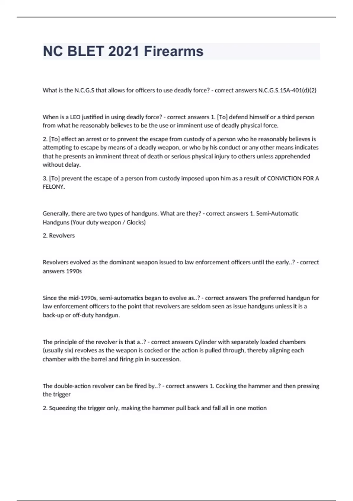 NC BLET 2021 Firearms What is the N.C.G.S that allows for officers to use deadly force? - correct answers N.C.G.S.15A-401(d)(2) When is a LEO justified in using deadly force? - correct answers 1. [To] defend himself or a third person from what he reasonably believes to be the use or imminent use of deadly physical force. 2. [To] effect an arrest or to prevent the escape from custody of a person who he reasonably believes is attempting to escape by means of a deadly weapon, or who by his conduct or any other means indicates that he presents an imminent threat of death or serious physical injury to others unless apprehended without delay. 3. [To] prevent the escape of a person from custody imposed upon him as a result of CONVICTION FOR A FELONY. Generally, there are two types of handguns. What are they? - correct answers 1. Semi-Automatic Handguns (Your duty weapon / Glocks) 2. Revolvers Revolvers evolved as the dominant weapon issued to law enforcement officers until the early..? - correct answers 1990s Since the mid-1990s, semi-automatics began to evolve as..? - correct answers The preferred handgun for law enforcement officers to the point that revolvers are seldom seen as issue handguns unless it is a back-up or off-duty handgun. The principle of the revolver is that a..? - correct answers Cylinder with separately loaded chambers (usually six) revolves as the weapon is cocked or the action is pulled through, thereby aligning each chamber with the barrel and firing pin in succession. The double-action revolver can be fired by..? - correct answers 1. Cocking the hammer and then pressing the trigger 2. Squeezing the trigger only, making the hammer pull back and fall all in one motion Most cylinders of Smith and Wesson revolvers rotate..? - correct answers Counterclockwise The cylinders of Colt revolvers rotate..? - correct answers Clockwise The cylinder latches of various makes of revolvers do..? - correct answers Not all work the same. For example, the cylinder latch on a Smith and Wesson must be pushed forward, while on a Colt, the latch must be pulled back, and on the Ruger, it is pushed into the frame. When shooting a revolver the shooter needs to learn to hold the handgun in the..? - correct answers Support hand and load with the dominant hand. Semi-automatic pistols are used almost unanimously by law enforcement agencies in the United States and are issued by every law enforcement agency in..? - correct answers North Carolina who issues a duty handgun. What is a Slide back, or emergency reload? - correct answers A slide back or emergency reload when the weapon is empty, and the slide is locked to the rear. Drop the empty magazine, insert a new magazine, and pull the slide to the rear to chamber a round. What is a Slide forward reload? - correct answers There are two types of reloads when the slide is forward: magazine change and magazine save. a) Magazine change: Drop the old magazine, insert a new magazine, and continue. Since there is a live round left in the chamber, there is no need to rack the slide. (b) Magazine save: Obtain the new magazine and bring to the base of the grip. Release the old magazine capturing it in the support hand, insert the new magazine, then secure the old magazine rather than dropping it; or remove the old magazine and secure it, then insert a new magazine. Some of the more commonly used semi-automatics in law enforcement are the..? - correct answers Glock, Smith & Wesson M&P, Sig Sauer, and Beretta pistols. The Sig Sauers and Berettas are known as traditional double-action semi-automatics and function like..? - correct answers The revolver for the first shot. They are carried with the trigger forward and the hammer down. By pulling the trigger, the shooter cocks the weapon and fires all in one motion. After firing the first round, the weapon cocks itself, the hammer remaining rearward. Subsequent rounds are fired by pulling the trigger single-action. Shotguns are usually smooth bored, while handguns and rifles usually have some sort of cuts to them. What are these called? - correct answers Longitudinal grooves, cut spirally into the bore of their barrels. The ridges or raised portions between the grooves are called lands. These grooves cause a bullet to spin as it travels in the barrel after being fired and makes it subsequent travel outside the barrel more stable and accurate What makes up modern ammunition? - correct answers 1. The case 2. The primer 3. The Powder Charge 4. The Bullet There are two types of powders. What are they and what are their differences? - correct answers 1. Modern smokeless powder when ignited in the open burns at a rather slow, sustained rate. Confined in the chamber of the firearm, however, the powder burns so fast it appears to explode. There are many kinds of smokeless powders of various grain and composition, for use in different guns. The basic difference lies in the burning rate and the amount of gas produced. 2. Black powder, on the other hand, is less stable than smokeless powder and has explosive qualities, whether burned in confined areas or not. It has no sustained rate of burning. Misfire is the term used to describe..? - correct answers the situation where the primer fails to ignite the powder charge Hang fire represents the temporary..? - correct answers failure of the primer Squib load is the term used to describe the situation where a cartridge is loaded with a primer but..? - correct answers no powder or insufficient powder