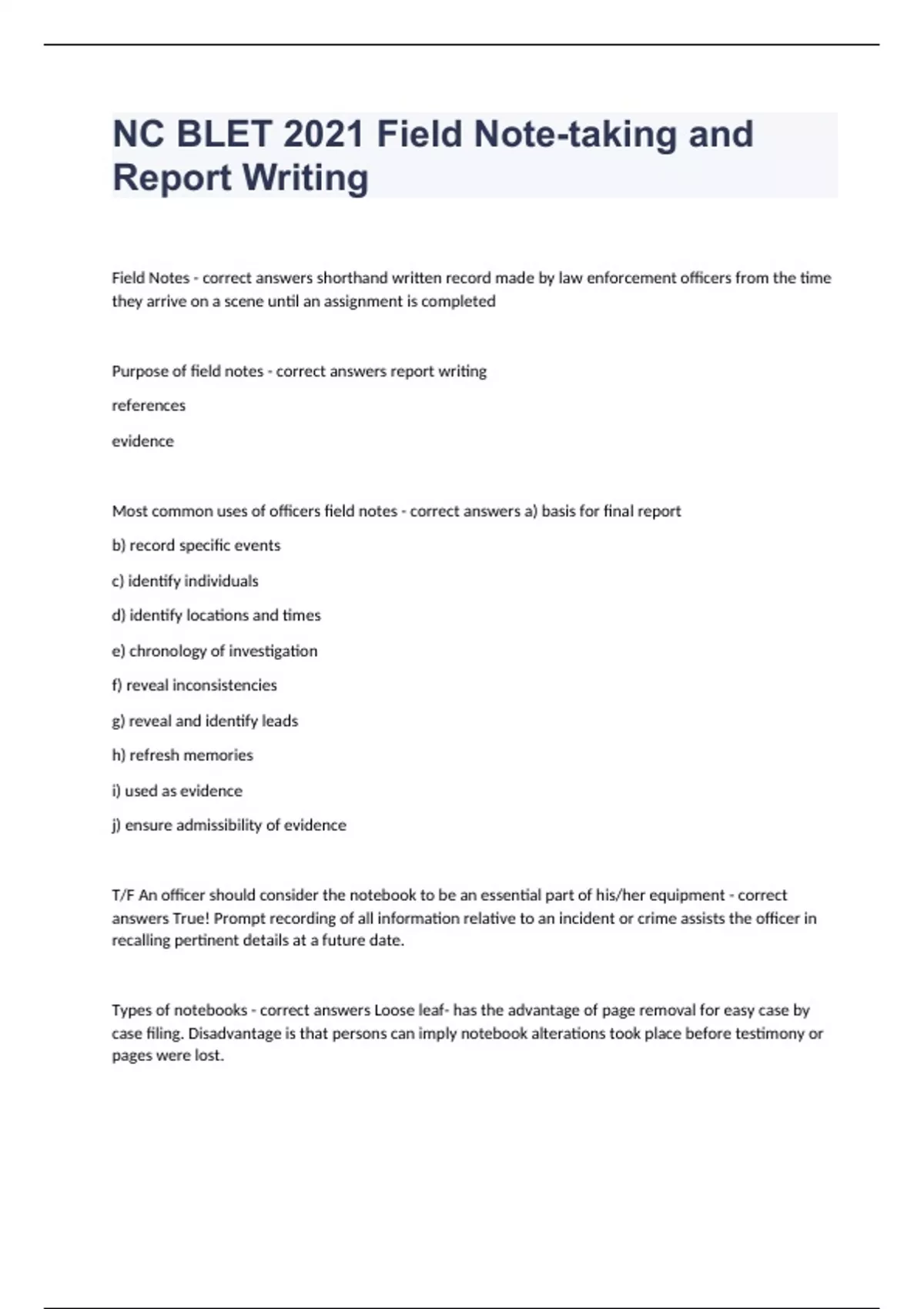 NC BLET 2021 Field Note-taking and Report WritingField Notes - correct answers shorthand written record made by law enforcement officers from the time they arrive on a scene until an assignment is completed Purpose of field notes - correct answers report writing references evidence Most common uses of officers field notes - correct answers a) basis for final report b) record specific events c) identify individuals d) identify locations and times e) chronology of investigation f) reveal inconsistencies g) reveal and identify leads h) refresh memories i) used as evidence j) ensure admissibility of evidence T/F An officer should consider the notebook to be an essential part of his/her equipment - correct answers True! Prompt recording of all information relative to an incident or crime assists the officer in recalling pertinent details at a future date. Types of notebooks - correct answers Loose leaf- has the advantage of page removal for easy case by case filing. Disadvantage is that persons can imply notebook alterations took place before testimony or pages were lost. Bound- the pages cannot be altered easily; notes pertinent to other investigations contained in the notebook may be compromised during cross examination or discovery. Identify your notebook - correct answers 1) write your name, rank and departmental identification number on the inside 2) indicate the date you started using the notebook, as well as the date when finished. Indicate the dates the notes were taken on each page, and store it chronologically and ensure it is secured. 3) cover sheets of the notebook include pertinent information that can be utilized in the field such as; -telephone numbers of specialized police units as well as other law enforcement and community service agencies. -important reference information, including phone numbers for local hospitals and magistrate offices. -Start of your tour of duty, enter the date, your assignment, name of partner and supervisor, and weather conditions Information contained in field notes - correct answers 1) Identification of investigating officers 2) Dates and times 3) Locations 4) Sketches 5) Names or identification of anyone involved, or potentially involved, in the incident, such as victims and witnesses 6) Results of interviews, including direct quotes where they are appropriate 7) Investigative leads 8) Weather conditions 9) Telephone numbers, home, business, cell, and alternate numbers 10) Addresses, both permanent, temporary and alternate addresses for all witnesses 11) Descriptions of people, places, things Writing instruments - correct answers Pencil Pen Notes are handwritten or hand printed