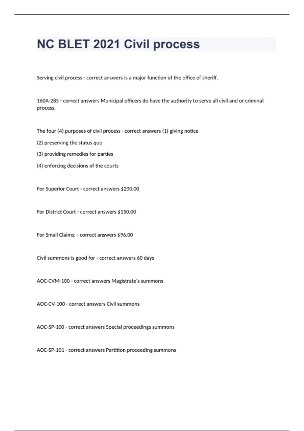 NC BLET 2021 Civil processServing civil process - correct answers is a major function of the office of sheriff. 160A-285 - correct answers Municipal officers do have the authority to serve all civil and or criminal process. The four (4) purposes of civil process - correct answers (1) giving notice (2) preserving the status quo (3) providing remedies for parties (4) enforcing decisions of the courts For Superior Court - correct answers $200.00 For District Court - correct answers $150.00 For Small Claims: - correct answers $96.00 Civil summons is good for - correct answers 60 days AOC-CVM-100 - correct answers Magistrate's summons AOC-CV-100 - correct answers Civil summons AOC-SP-100 - correct answers Special proceedings summons AOC-SP-101 - correct answers Partition proceeding summons AOC-J-340 - correct answers Juvenile summons (undisciplined/delinquent) AOC-J-142 - correct answers Juvenile summons (abuse/neglect/dependent) juvenile proceeding is initiated because a juvenile is alleged to be abused, neglected, or dependent. AOC-J-208 - correct answers Summons in proceeding to terminate parental rights AOC-G-100 - correct answers Subpoena There are two (2) main kinds of subpoenas - correct answers 1. To testify, which is an order to a witness to appear to testify at a court proceeding or deposition 2. to produce evidence (formally called a subpoena duces tecum), which is an order to bring specified evidence (which may include designated documents, records, books, etc Chapter 95 - correct answers allows an employer to act on behalf of an employee who has been threatened at their place of employment to apply for a civil no-contact order covering the workplace. Natural person - correct answers individual human being (as opposed to a business, unit of government, or some other kind of legal entity corporation definition - correct answers legal entity separate and distinct from its shareholders. Two types of papers - correct answers 1. Complaint (why suing) 2. Summons (theyre being sued and what they need to do to protect themselves.) The different types of parties to be served - correct answers 1. Natural person 2. Corporation 3. Partnership Usual place of abode - correct answers means the place where the party is living at the time service is made, except for temporary absences, a person's residence or domicile