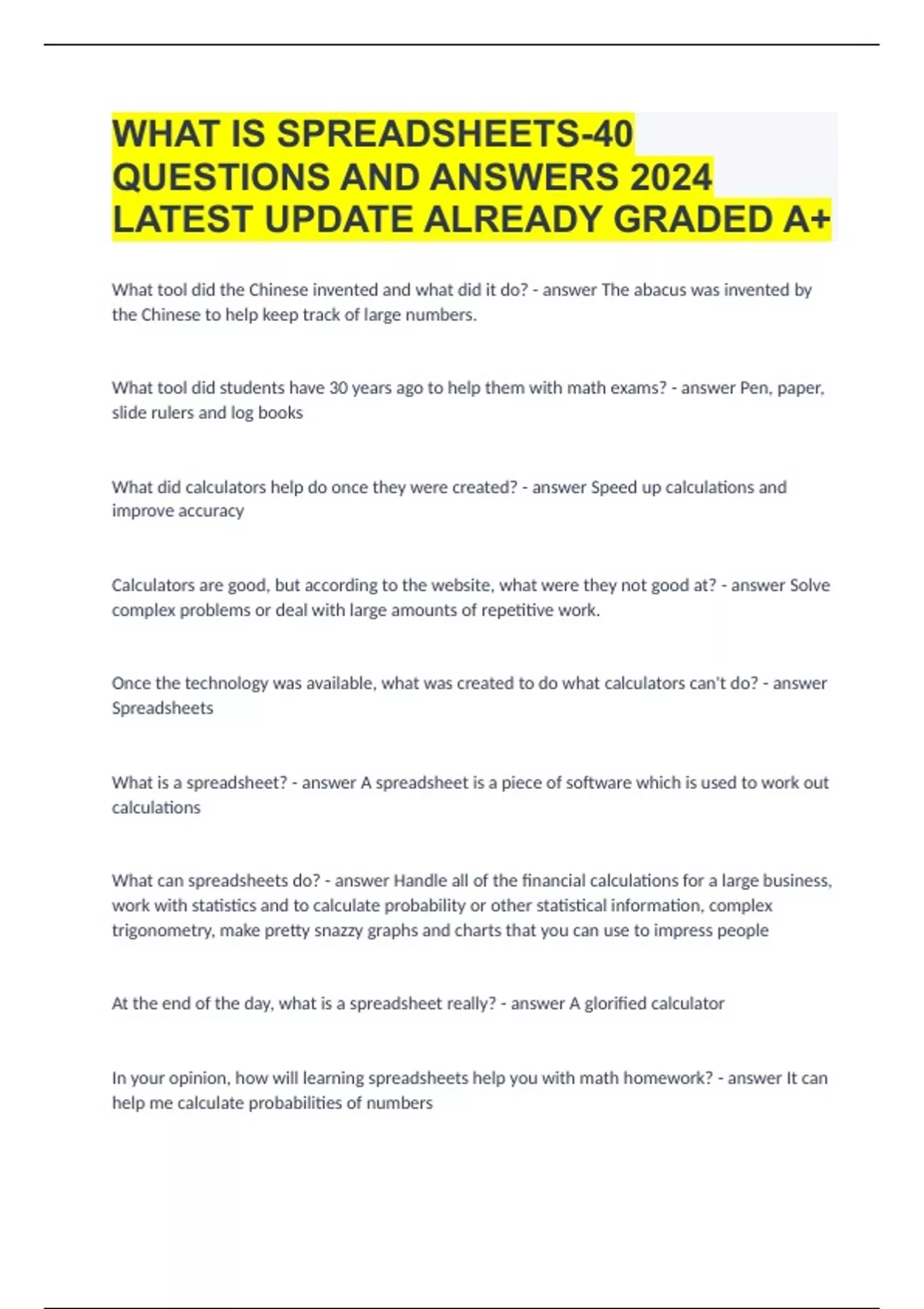 WHAT IS SPREADSHEETS-40 QUESTIONS AND ANSWERS 2024 LATEST UPDATE ALREADY GRADED A+
