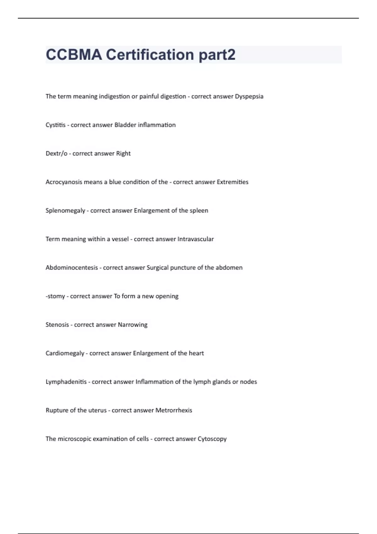 CCBMA Certification part2 Questions with complete solution 2023/2024The term meaning indigestion or painful digestion - correct answer Dyspepsia Cystitis - correct answer Bladder inflammation Dextr/o - correct answer Right Acrocyanosis means a blue condition of the - correct answer Extremities Splenomegaly - correct answer Enlargement of the spleen Term meaning within a vessel - correct answer Intravascular Abdominocentesis - correct answer Surgical puncture of the abdomen -stomy - correct answer To form a new opening