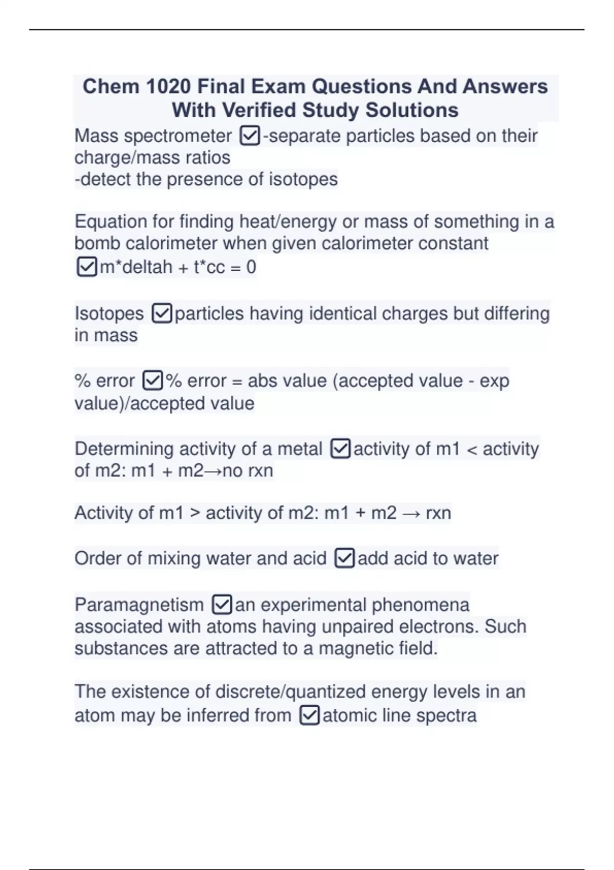 Chem 1020 Final Exam Questions And Answers With Verified Study Solutions Chem 1020 Final Exam Questions And Answers With Verified Study Solutions