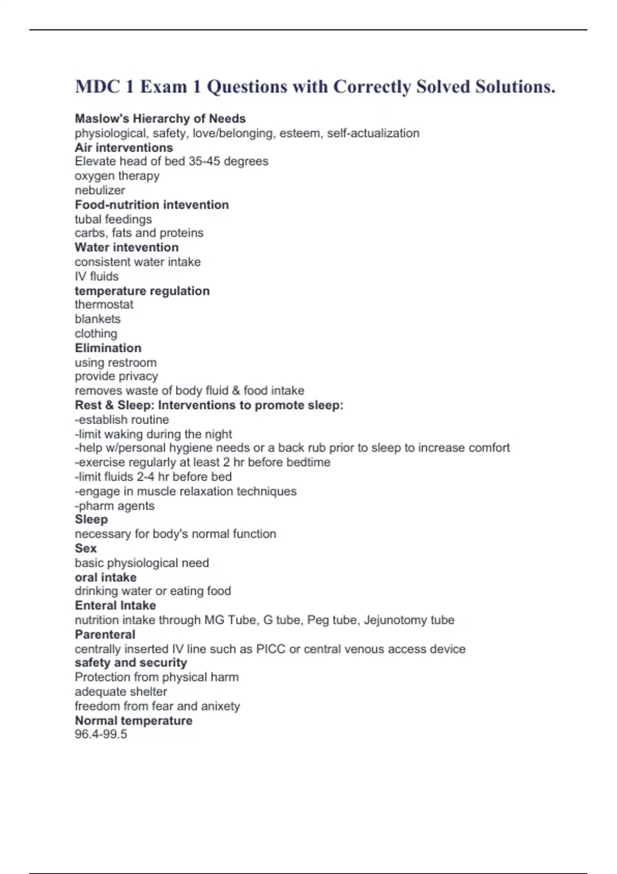 MDC 1 Exam 1 Questions with Correctly Solved Solutions. Maslow's Hierarchy of Needs physiological, safety, love/belonging, esteem, self-actualization Air interventions Elevate head of bed 35-45 degrees oxygen therapy nebulizer Food-nutrition intevention tubal feedings carbs, fats and proteins Water intevention consistent water intake IV fluids temperature regulation thermostat blankets clothing Elimination using restroom provide privacy removes waste of body fluid & food intake Rest & Sleep: Interventions to promote sleep: -establish routine -limit waking during the night -help w/personal hygiene needs or a back rub prior to sleep to increase comfort -exercise regularly at least 2 hr before bedtime -limit fluids 2-4 hr