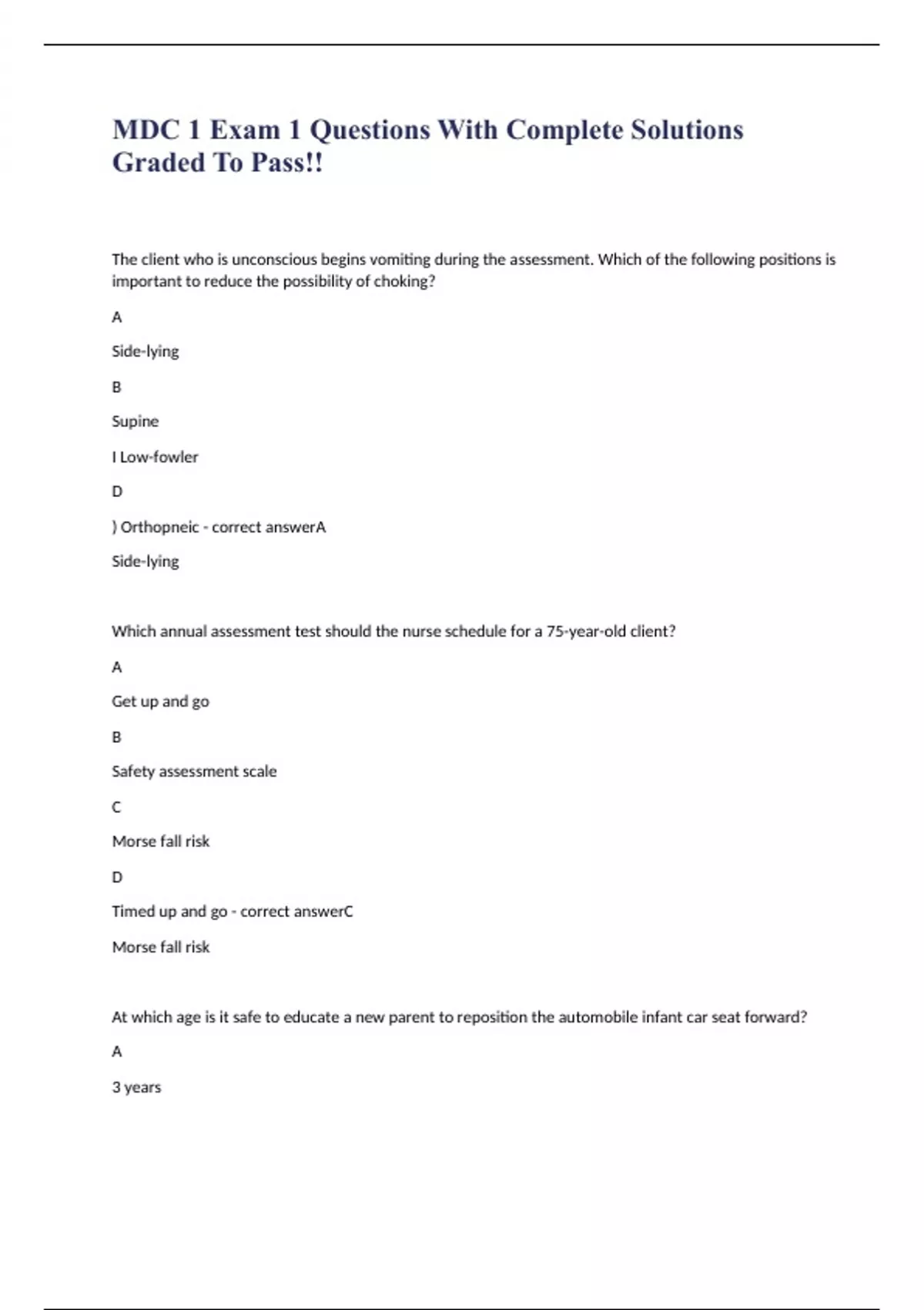 MDC 1 Exam 1 Questions With Complete Solutions Graded To Pass!! The client who is unconscious begins vomiting during the assessment. Which of the following positions is important to reduce the possibility of choking? A Side-lying B Supine I Low-fowler D ) Orthopneic - correct answerA Side-lying Which annual assessment test should the nurse schedule for a 75-year-old client? A Get up and go B Safety assessment scale C