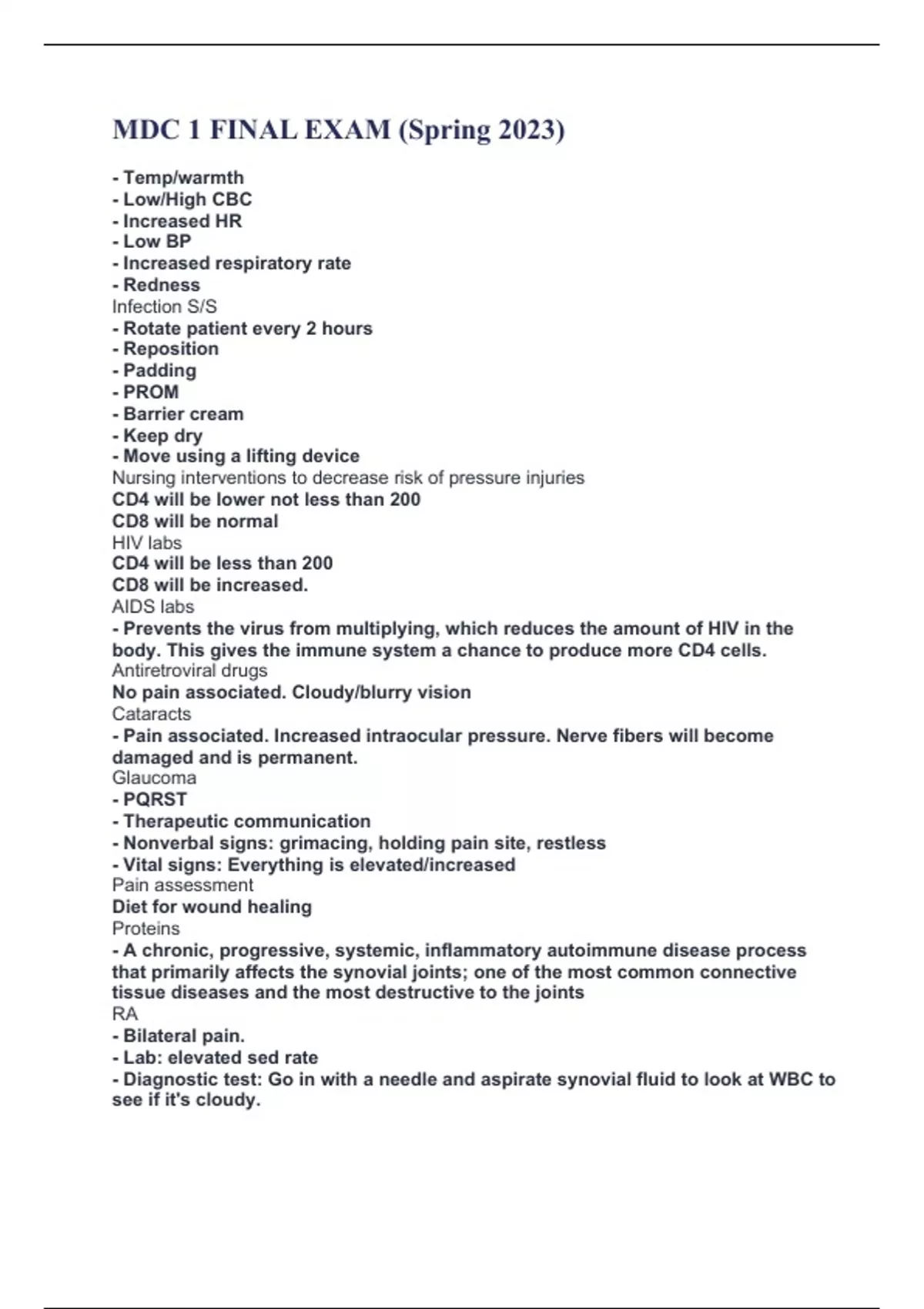 MDC 1 FINAL EXAM (Spring 2023) - Temp/warmth - Low/High CBC - Increased HR - Low BP - Increased respiratory rate - Redness Infection S/S - Rotate patient every 2 hours - Reposition - Padding - PROM - Barrier cream - Keep dry - Move using a lifting device Nursing interventions to decrease risk of pressure injuries CD4 will be lower not less than 200 CD8 will be normal HIV labs CD4 will be less than 200 CD8 will be increased. AIDS labs - Prevents the virus from multiplying, which reduces the amount of HIV in the body. This gives the immune system a chance to produce more CD4 cells.