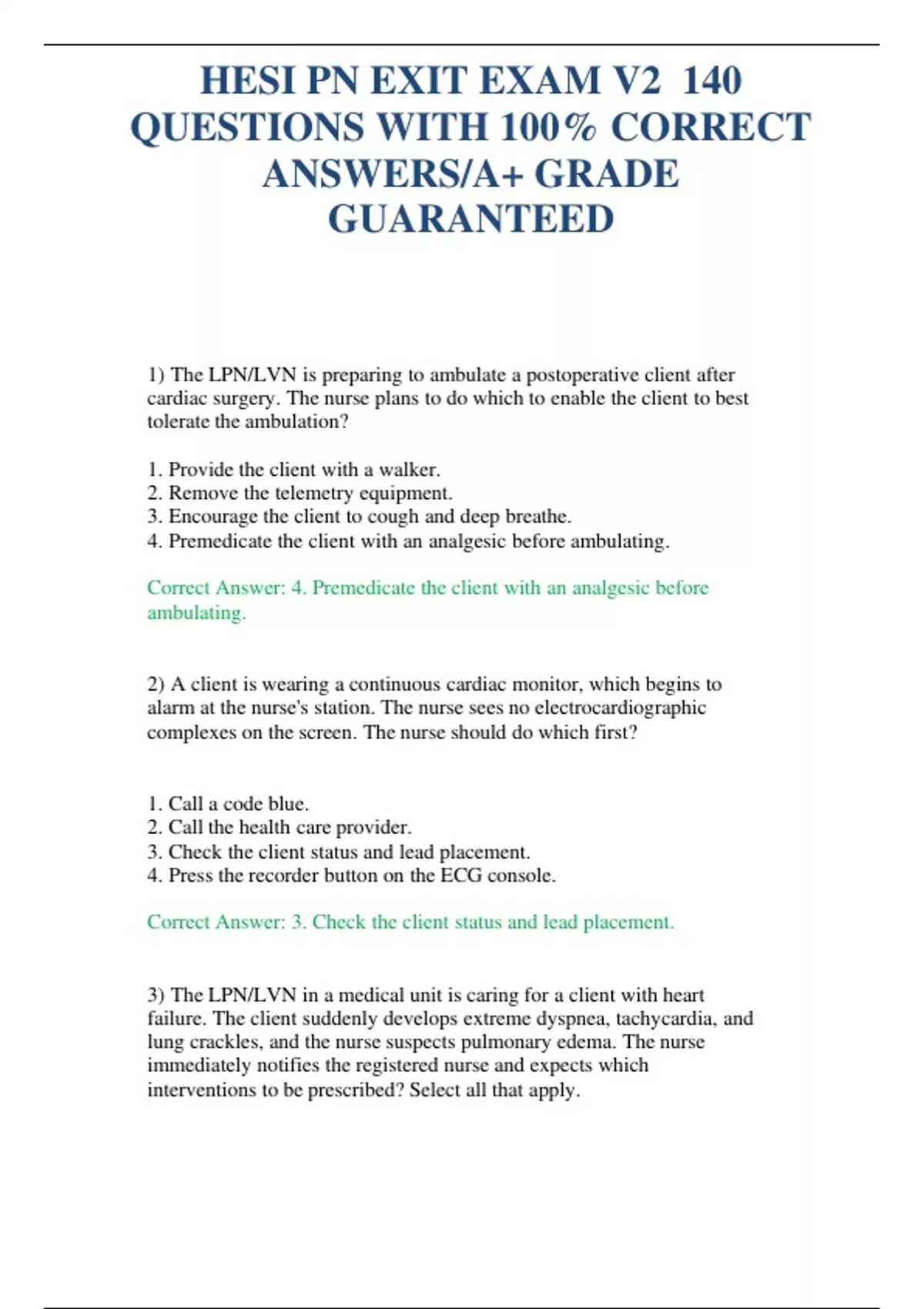 HESI PN EXIT EXAM V2 140 QUESTIONS WITH 100% CORRECT ANSWERS/A+ GRADE GUARANTEED 1) The LPN/LVN is preparing to ambulate a postoperative client after cardiac surgery. The nurse plans to do which to enable the client to best tolerate the ambulation? 1. Provide the client with a walker. 2. Remove the telemetry equipment. 3. Encourage the client to cough and deep breathe. 4. Premedicate the client with an analgesic before ambulating. Correct Answer: 4. Premedicate the client with an analgesic before ambulating. 2) A client is wearing a continuous cardiac monitor, which begins to alarm at the nurse's station. The nurse sees no electrocardiographic complexes on the screen. The nurse should do which first? 1. Call a code blue. 2. Call the health care provider. 3. Check the client status and lead placement. 4. Press the recorder button on the ECG console. Correct Answer: 3. Check the client status and lead placement. 3) The LPN/LVN in a medical unit is caring for a client with heart failure. The client suddenly develops extreme dyspnea, tachycardia, and lung crackles, and the nurse suspects pulmonary edema. The nurse immediately notifies the registered nurse and expects which interventions to be prescribed? Select all that apply. HESI PN EXIT EXAM V2 140 QUESTIONS WITH 100% CORRECT ANSWERS/A+ GRADE GUARANTEED 1. Administering oxygen 2. Inserting a Foley catheter 3. Administering furosemide (Lasix) 4. Administering morphine sulfate intravenously 5. Transporting the client to the coronary care unit HESI PN EXIT EXAM V2 140 QUESTIONS WITH 100% CORRECT ANSWERS/A+ GRADE GUARANTEED 6. Placing the client in a low-Fowler's side-lying position Correct Answer: 1. Administering oxygen 2. Inserting a Foley catheter 3. Administering furosemide (Lasix) 4) The nurse is monitoring a client following cardioversion. Which observations s