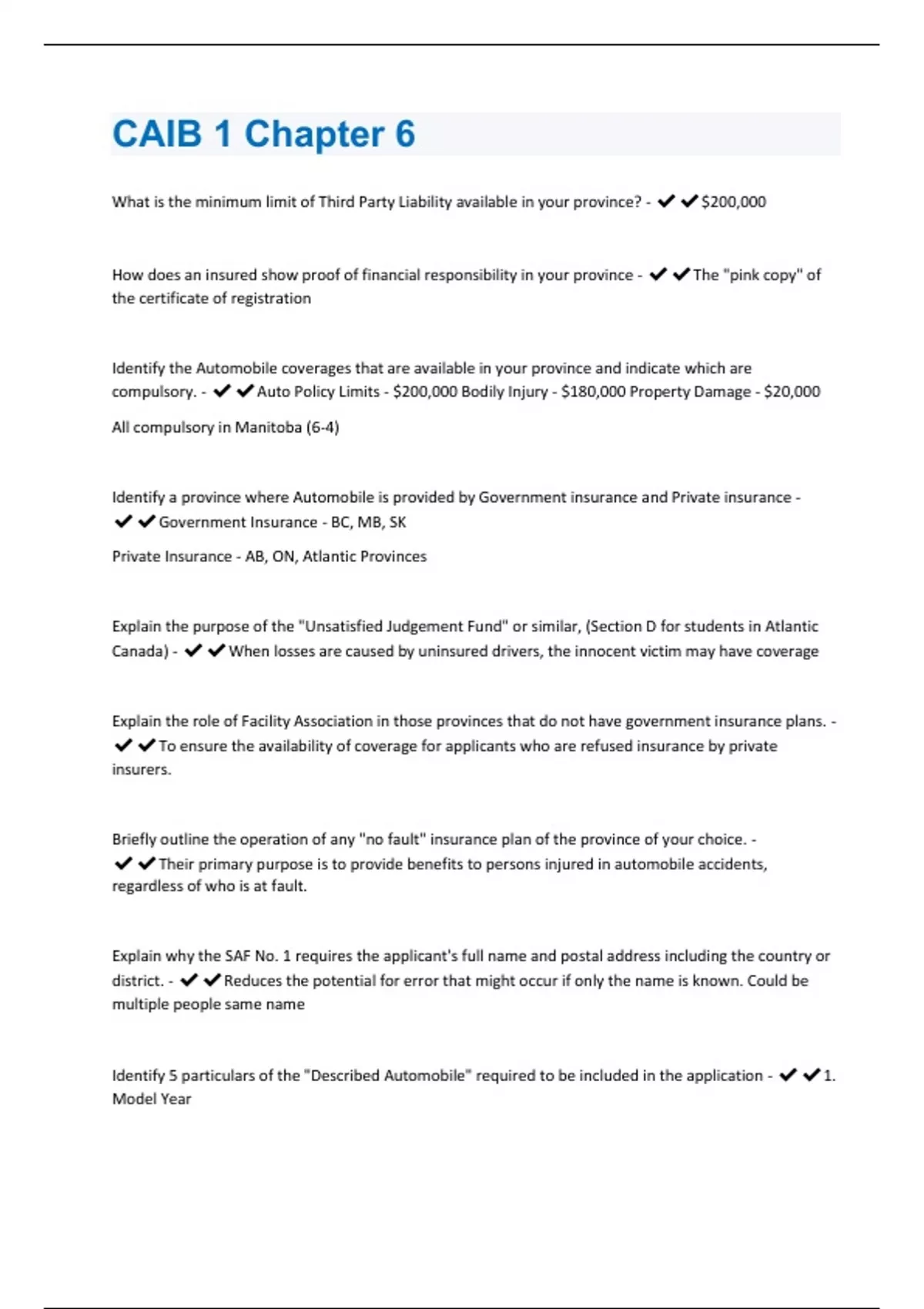 What is the minimum limit of Third Party Liability available in your province? - $200,000 How does an insured show proof of financial responsibility in your province - The "pink copy" of the certificate of registration Identify the Automobile coverages that are available in your province and indicate which are compulsory. - Auto Policy Limits - $200,000 Bodily Injury - $180,000 Property Damage - $20,000 All compulsory in Manitoba (6-4) Identify a province where Automobile is provided by Government insurance and Private insurance - Government Insurance - BC, MB, SK Private Insurance - AB, ON, Atlantic Provinces Explain the purpose of the "Unsatisfied Judgement Fund" or similar, (Section D for students in Atlantic Canada) - When losses are caused by uninsured drivers, the innocent victim may have coverage Explain the role of Facility Association in those provinces that do not have government insurance plans. - To ensure the availability of coverage for applicants who are refused insurance by private insurers. Briefly outline the operation of any "no fault" insurance plan of the province of your choice. - Their primary purpose is to provide benefits to persons injured in automobile accidents, regardless of who is at fault. Explain why the SAF No. 1 requires the applicant's full name and postal address including the country or district. - Reduces the potential for error that might occur if only the name is known. Could be multiple people same name Identify 5 particulars of the "Described Automobile" required to be included in the application - 1. Model Year2. Trade Name 3. Model or C. C. 4. Body Type 5. V. I. N. Identify 3 items of information about all drivers required in the application. - 1. Name of all drivers (as shown on driver's license) 2. Approximate percentage of use of the automobile 3. Number of years licensed Identify 8 physical and mental disabilities which might affect the safe operation of a vehicle. - 1. Frequent fainting spells 2. Dizziness or loss of consciousness 3. Heart Disorder 4. Epilepsy 5. Diabetes 6. Defective vision or hearing 7. Nervous disorder 8. Depression Identify 4 business uses of the automobile that must be disclosed to the insurer because a special endorsement is required. - 1. Rented or leased to others 2. Used for carrying passengers for compensation or hire 3. Used for the carrying of explosives or radioactive material 4. Used for the transportation of goods for compensation Identify 5 situations where the right of the insured to recovery may be forfeited if not disclosed on the application - 1. Provides a false description of the automobile which is prejudice of the insurer 2. Knowingly misrepresents the risk or fails to disclose a required fact 3. Breaches a policy term (using for illicit or prohibited trade or transportation)4. Commits a fraud (insured causes the loss) 5. Willfully makes a false statement in respect of a claim Identify 3 persons insured under SectionA of the SPF No 1. - 1. The named insured 2. Everyone else who personally drives the automobile with the consent of the Named Insured 3. Everyone who personally operates a part of the automobile with the consent of the Insured Identify 5 exclusions that are general to Section A. -1. Any liability imposed by any workers' compensation law 2. Loss or damage resulting from bodily injury to or the death of any employee of any person insured in this section while engaged in the operation or repair of the automobile 3. Loss of damage to the property carried in or upon the automobile 4. Any amount in excess of the limit(s) stated in Section A of item 4 of the application 5. Any liability arising from contamination of property carried in the automobile Explain how, if at all, Section A would respond if the insured was intoxicated at the time of loss. - Insures bodily injury and property damage caused by insureds while under the influence. Without this coverage, the victims or their families would end up bearing the costs of the insured's negligent actions themselves. Identify 2 agreements of the insured under Section A. - 1. Acceptance of the policy, the insured "constitutes and appoints the insurer as his irrevocable attorney. 2. Insured also agrees to reimburse the insurer for any amounts paid under the policy by reason of the provisions of any statute relating to automobile insurance and which the insurer would not otherwise be liable to pay under the policy