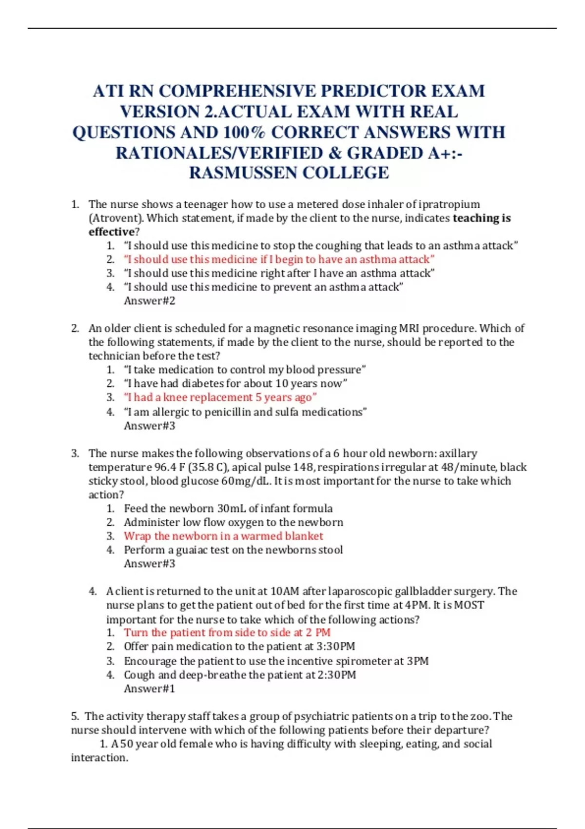 ATI RN COMPREHENSIVE PREDICTOR EXAM VERSION 2.ACTUAL EXAM WITH REAL QUESTIONS AND 100% CORRECT ANSWERS WITH RATIONALES/VERIFIED & GRADED A+:-RASMUSSEN COLLEGE