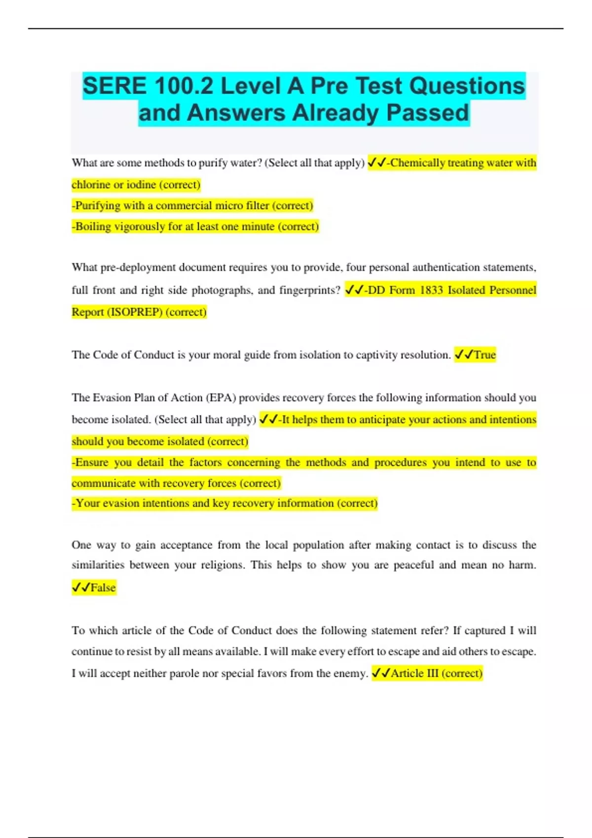 SERE 100.2 Level A Pre Test Questions and Answers Already Passed