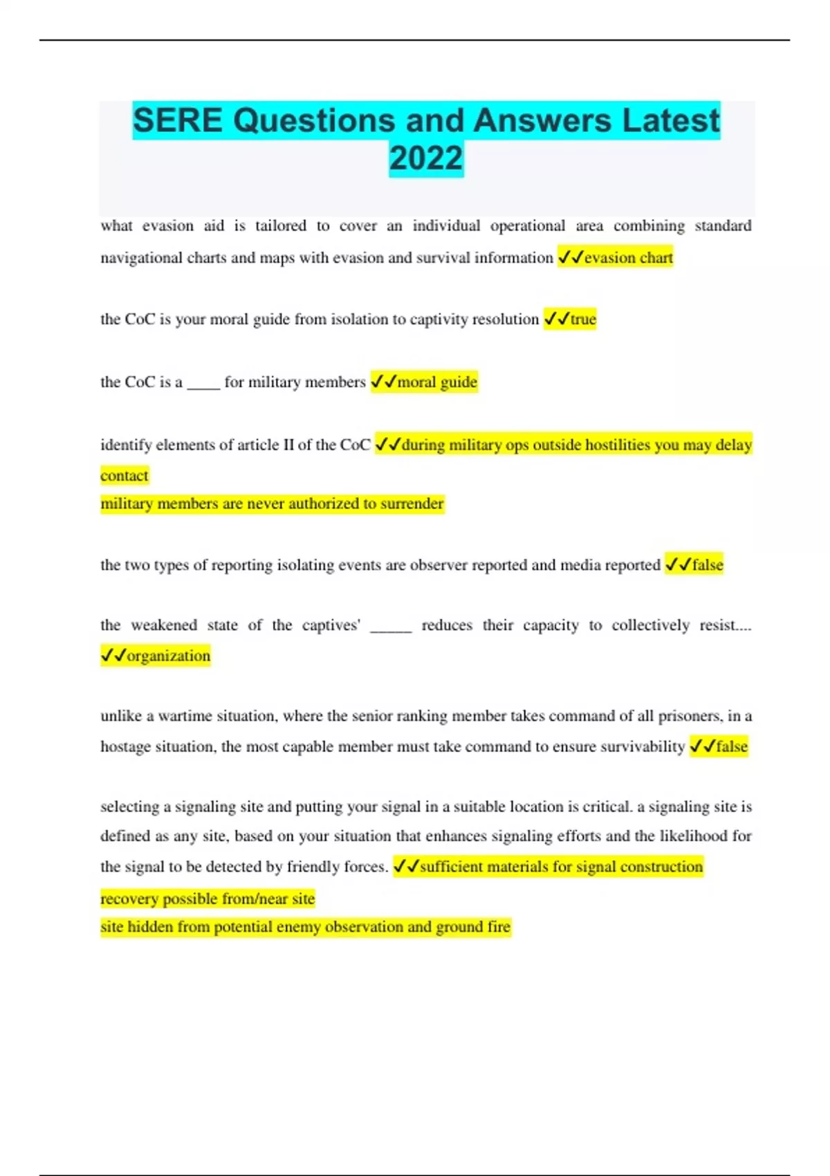 what evasion aid is tailored to cover an individual operational area combining standard navigational charts and maps with evasion and survival information evasion chart the CoC is your moral guide from isolation to captivity resolution true the CoC is a ____ for military members moral guide identify elements of article II of the CoC during military ops outside hostilities you may delay contact military members are never authorized to surrender the two types of reporting isolating events are observer reported and media reported false the weakened state of the captives' _____ reduces their capacity to collectively resist.... organization unlike a wartime situation, where the senior ranking member takes command of all prisoners, in a hostage situation, the most capable member must take command to ensure survivability false
