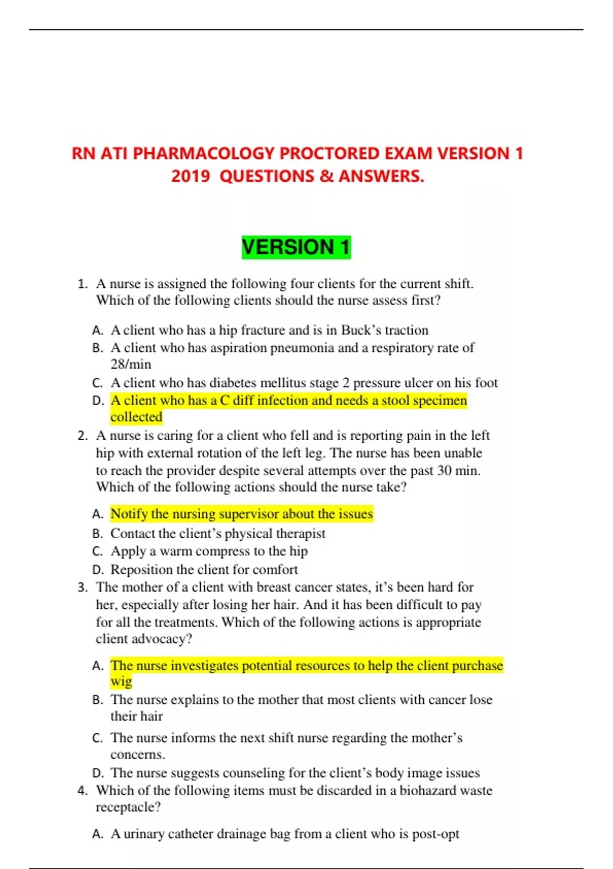 . A nurse is assigned the following four clients for the current shift. Which of the following clients should the nurse assess first? A. A client who has a hip fracture and is in Buck’s traction B. A client who has aspiration pneumonia and a respiratory rate of 28/min C. A client who has diabetes mellitus stage 2 pressure ulcer on his foot D. A client who has a C diff infection and needs a stool specimen collected 2. A nurse is caring for a client who fell and is reporting pain in the left hip with external rotation of the left leg. The nurse has been unable to reach the provider despite several attempts over the past 30 min. Which of the following actions should the nurse take? A. Notify the nursing supervisor about the issues B. Contact the client’s physical therapist C. Apply a warm compress to the hip D. Reposition the client for comfort 3. The mother of a client with breast cancer states, it’s been hard for her, especially after losing her hair. And it has been difficult to pay for all the treatments. Which of the following actions is appropriate client advocacy? A. The nurse investigates potential resources to help the client purchase