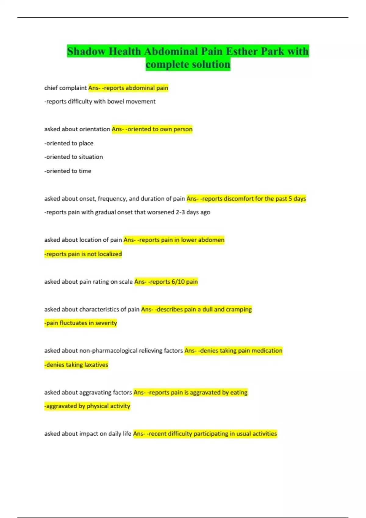 Shadow Health Abdominal Pain Esther Park with complete solution chief complaint Ans- -reports abdominal pain -reports difficulty with bowel movement asked about orientation Ans- -oriented to own person -oriented to place -oriented to situation -oriented to time asked about onset, frequency, and duration of pain Ans- -reports discomfort for the past 5 days -reports pain with gradual onset that worsened 2-3 days ago asked about location of pain Ans- -reports pain in lower abdomen -reports pain is not localized asked about pain rating on scale Ans- -reports 6/10 pain asked about characteristics of pain Ans- -describes pain a dull and cramping -pain fluctuates in severity asked about non-pharmacological relieving factors Ans- -denies taking pain medication -denies taking laxatives asked about aggravating factors Ans- -reports pain is aggravated by eating -aggravated by physical activity asked about impact on daily life Ans- -recent difficulty participating in usual activities