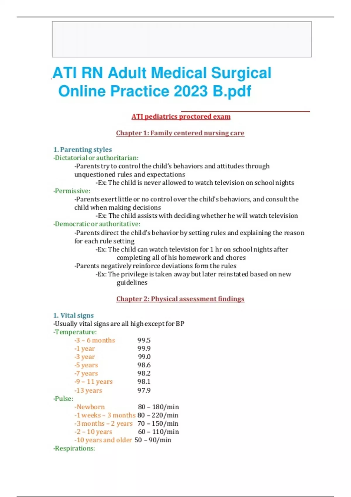 1. Parenting styles -Dictatorial or authoritarian: -Parents try to control the child’s behaviors and attitudes through unquestioned rules and expectations -Ex: The child is never allowed to watch television on school nights -Permissive: -Parents exert little or no control over the child’s behaviors, and consult the child when making decisions -Ex: The child assists with deciding whether he will watch television -Democratic or authoritative: -Parents direct the child’s behavior by setting rules and explaining the reason for each rule setting -Ex: The child can watch television for 1 hr on school nights after completing all of his homework and chores -Parents negatively reinforce deviations form the rules -Ex: The privilege is taken away but later reinstated based on new guidelines Chapter 2: Physical assessment findings 1. Vital signs -Usually vital signs are all high except for BP -Temperature: -3 – 6 months 99.5 -1 year 99.9 -3 year 99.0 -5 years 98.6 -7 years 98.2 -9 – 11 years 98.1 -13 years 97.9 -Pulse: -Newborn 80 – 180/min -1 weeks – 3 months 80 – 220/min -3 months – 2 years 70 – 150/min -2 – 10 years 60 – 110/min -10 years and older 50 – 90/min -Respirations: -Newborn – 1year 30 – 35/mi
