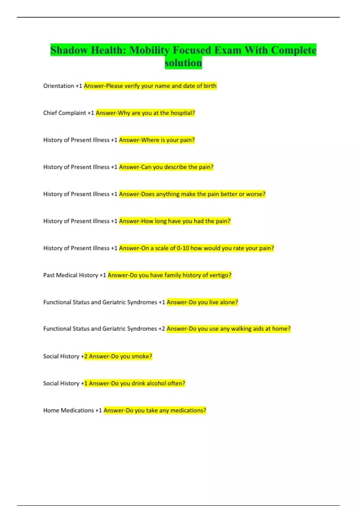 Shadow Health: Mobility Focused Exam With Complete solution Orientation +1 Answer-Please verify your name and date of birth Chief Complaint +1 Answer-Why are you at the hospital? History of Present Illness +1 Answer-Where is your pain? History of Present Illness +1 Answer-Can you describe the pain? History of Present Illness +1 Answer-Does anything make the pain better or worse? History of Present Illness +1 Answer-How long have you had the pain? History of Present Illness +1 Answer-On a scale of 0-10 how would you rate your pain? Past Medical History +1 Answer-Do you have family history of vertigo? Functional Status and Geriatric Syndromes +1 Answer-Do you live alone? Functional Status and Geriatric Syndromes +2 Answer-Do you use any walking aids at home? Social History +2 Answer-Do you smoke? Social History +1 Answer-Do you drink alcohol often? Home Medications +1 Answer-Do you take any medications?