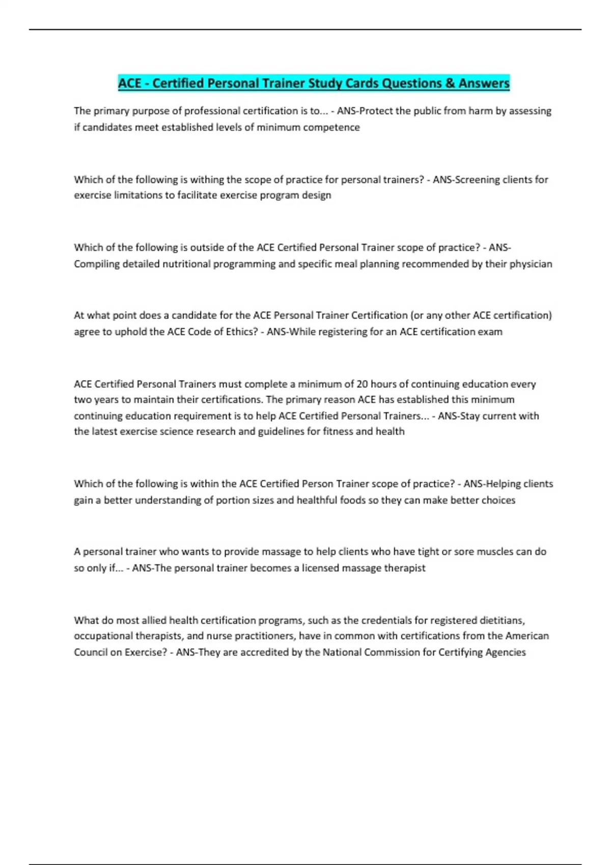 ACE - Certified Personal Trainer Study Cards Questions & Answers The primary purpose of professional certification is to... - ANS-Protect the public from harm by assessing if candidates meet established levels of minimum competence Which of the following is withing the scope of practice for personal trainers? - ANS-Screening clients for exercise limitations to facilitate exercise program design Which of the following is outside of the ACE Certified Personal Trainer scope of practice? - ANSCompiling detailed nutritional programming and specific meal planning recommended by their physician At what point does a candidate for the ACE Personal Trainer Certification (or any other ACE certification) agree to uphold the ACE Code of Ethics? - ANS-While registering for an ACE certification exam ACE Certified Personal Trainers must complete a minimum of 20 hours of continuing education every two years to maintain their certifications. The primary reason ACE has established this minimum continuing education requirement is to help ACE Certified Personal Trainers... - ANS-Stay current with the latest exercise science research and guidelines for fitness and health Which of the following is within the ACE Certified Person Trainer scope of practice? - ANS-Helping clients gain a better understanding of portion sizes and healthful foods so they can make better choices A personal trainer who wants to provide massage to help clients who have tight or sore muscles can do so only if... - ANS-The personal trainer becomes a licensed massage therapist What do most allied health certification programs, such as the credentials for registered dietitians, occupational therapists, and nurse practitioners, have in common with certifications from the American Council on Exercise? - ANS-They are accredited by the National Commission for Certifying Agencies Which of the following is most accurate regarding personal trainers recommending supplements to their clients? - ANS-Unless the personal trainer has other credentials such as an R.D. or M.D., he or she does not possess the qualifications to legally recommend supplements ACE Certified Personal Trainers looking to advance their knowledge, skills, and abilities beyond their ACE Personal Trainer Certification would be best served by completing what continuing education? - ANS-An advanced fitness certification that is NCCA accredited As a general rule, ACE recommends that candidates allow _____ of study time to adequately prepare for the ACE Personal Trainer Certification Exam. - ANS-3 to 4 months What is the most important factor for an individual who is starting an exercise program? - ANSReadiness to change behavior related to exercise Which personal attribute is the most reliable predictor of an individual's participation in an exercise program? - ANS-Past exercise program participation What is the most common excuse used by people when dropping out of an exercise program? - ANS-A lack of time Which of the following strategies is the best for personal trainers to implement to enhance the likelihood that a client will continue working with them? - ANS-Encouraging client ownership of the program to facilitate development of intrinsic motivation A person who is confident that he or she can successfully participate regularly in an exercise program most likely... - ANS-Has high self-efficacy related to exercise Which of the following goals is most likely to enhance program participation and attainment? - A...