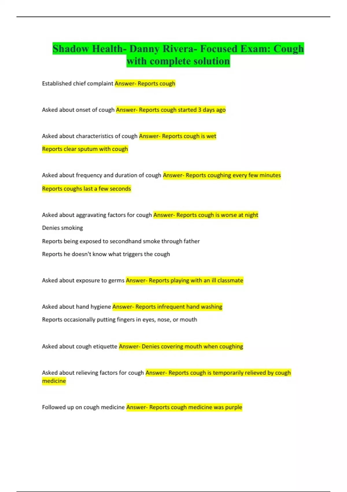 Shadow Health- Danny Rivera- Focused Exam: Cough with complete solution