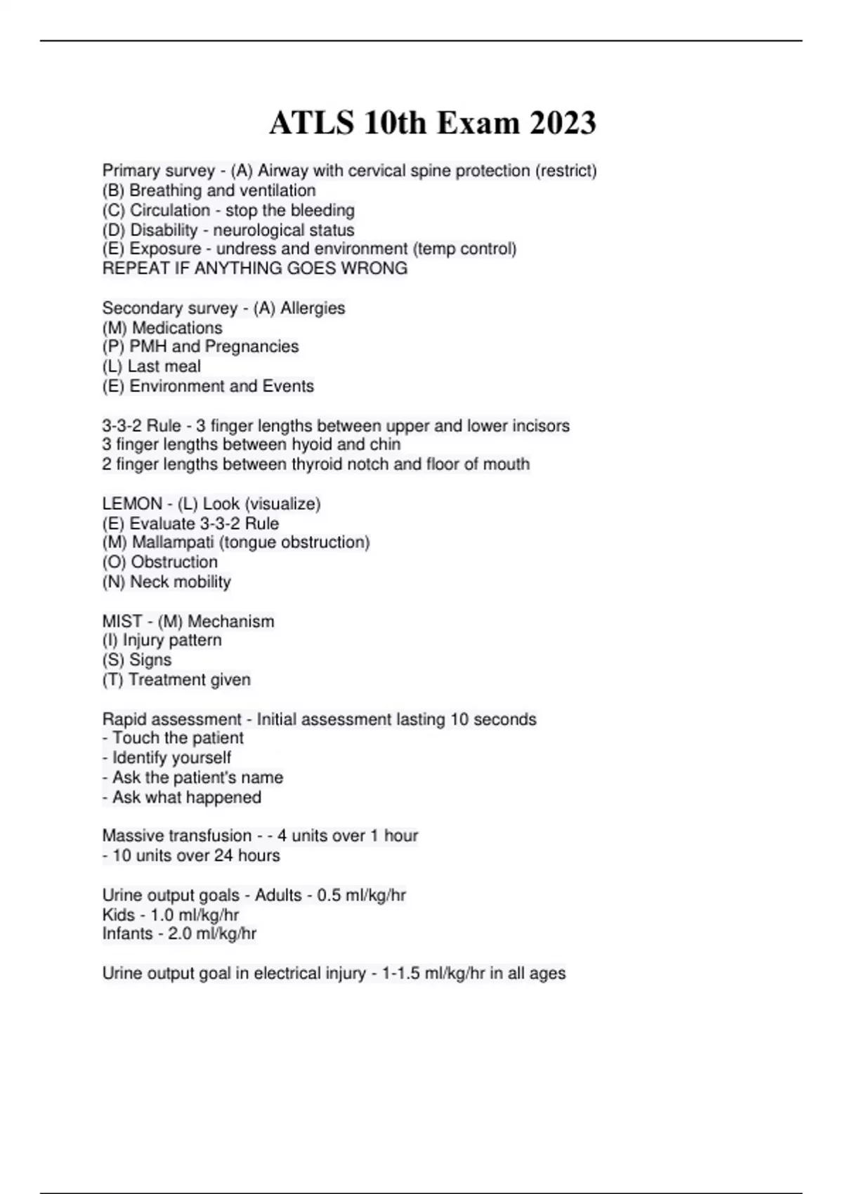 Primary survey - (A) Airway with cervical spine protection (restrict) (B) Breathing and ventilation (C) Circulation - stop the bleeding (D) Disability - neurological status (E) Exposure - undress and environment (temp control) REPEAT IF ANYTHING GOES WRONG Secondary survey - (A) Allergies (M) Medications (P) PMH and Pregnancies (L) Last meal (E) Environment and Events 3-3-2 Rule - 3 finger lengths between upper and lower incisors 3 finger lengths between hyoid and chin 2 finger lengths between thyroid notch and floor of mouth LEMON - (L) Look (visualize) (E) Evaluate 3-3-2 Rule (M) Mallampati (tongue obstruction) (O) Obstruction (N) Neck mobility MIST - (M) Mechanism (I) Injury pattern (S) Signs (T) Treatment given Rapid assessment - Initial assessment lasting 10 seconds - Touch the patient - Identify yourself - Ask the patient's name - Ask what happened Massive transfusion - - 4 units over 1 hour - 10 units over 24 hours Urine output goals - Adults - 0.5 ml/kg/hr Kids - 1.0 ml/kg/hr Infants - 2.0 ml/kg/hr Urine output goal in electrical injury - 1-1.5 ml/kg/hr in all ages Basilar skull fracture classic findings - - Rhinorrhea - Otorrhea - Hearing loss - Facial paralysis Burn fluid resuscitation formula - (2ml x ?kg x ?TSBA) ÷ 2 ÷ 8 How many people needed to log roll? - 4 Classes of hemorrhagic shock - Class 1 (0-14% blood loss) - no hemodynamic changes. - no treatment necessary. Class 2 (15-30% blood loss) - ↔/↑ HR - ↔ BP - ↔ RR - ↔ UO - Crystalloids and +/- blood