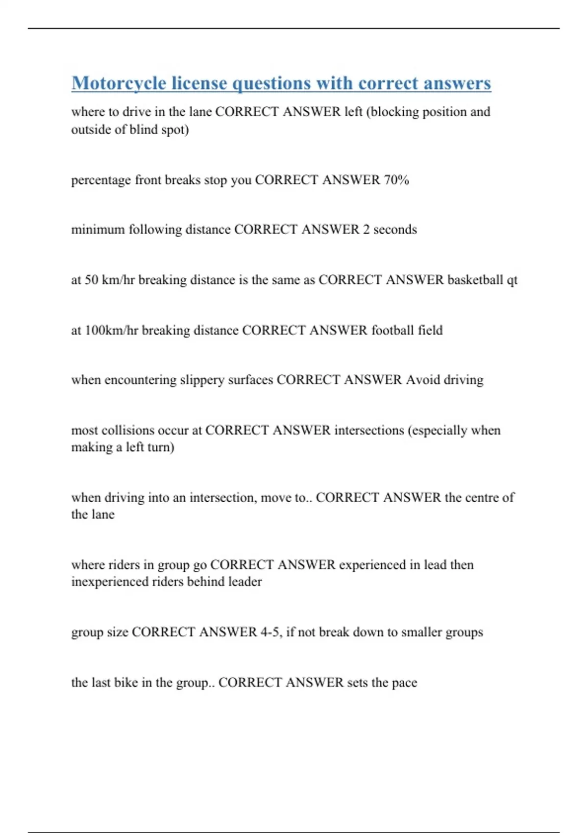 Motorcycle license questions with correct answers