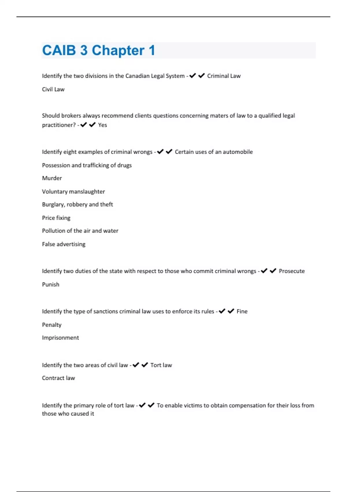 Identify the two divisions in the Canadian Legal System - Criminal Law Civil Law Should brokers always recommend clients questions concerning maters of law to a qualified legal practitioner? - Yes Identify eight examples of criminal wrongs - Certain uses of an automobile Possession and trafficking of drugs Murder Voluntary manslaughter Burglary, robbery and theft Price fixing Pollution of the air and water False advertising Identify two duties of the state with respect to those who commit criminal wrongs - Prosecute Punish Identify the type of sanctions criminal law uses to enforce its rules - Fine Penalty Imprisonment Identify the two areas of civil law - Tort law Contract law Identify the primary role of tort law - To enable victims to obtain compensation for their loss from those who caused itIdentify two kinds of torts for which compensation may be provided by the courts - Intentional torts Unintentional torts Identify the two ways that both criminal and civil laws are established - Common law Statute law Common law is also called case law. Identify how current court decisions are made in common law - Current court decisions must follow those made in cases having similar circumstances. This is known as Rule of Precedent