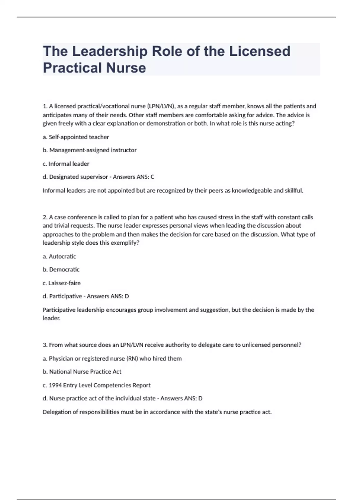 LVN Leadership roles Questions and Answers 2023/2024 1. A licensed practical/vocational nurse (LPN/LVN), as a regular staff member, knows all the patients and anticipates many of their needs. Other staff members are comfortable asking for advice. The advice is given freely with a clear explanation or demonstration or both. In what role is this nurse acting? a. Self-appointed teacher b. Management-assigned instructor c. Informal leader d. Designated supervisor - Answers ANS: C Informal leaders are not appointed but are recognized by their peers as knowledgeable and skillful.