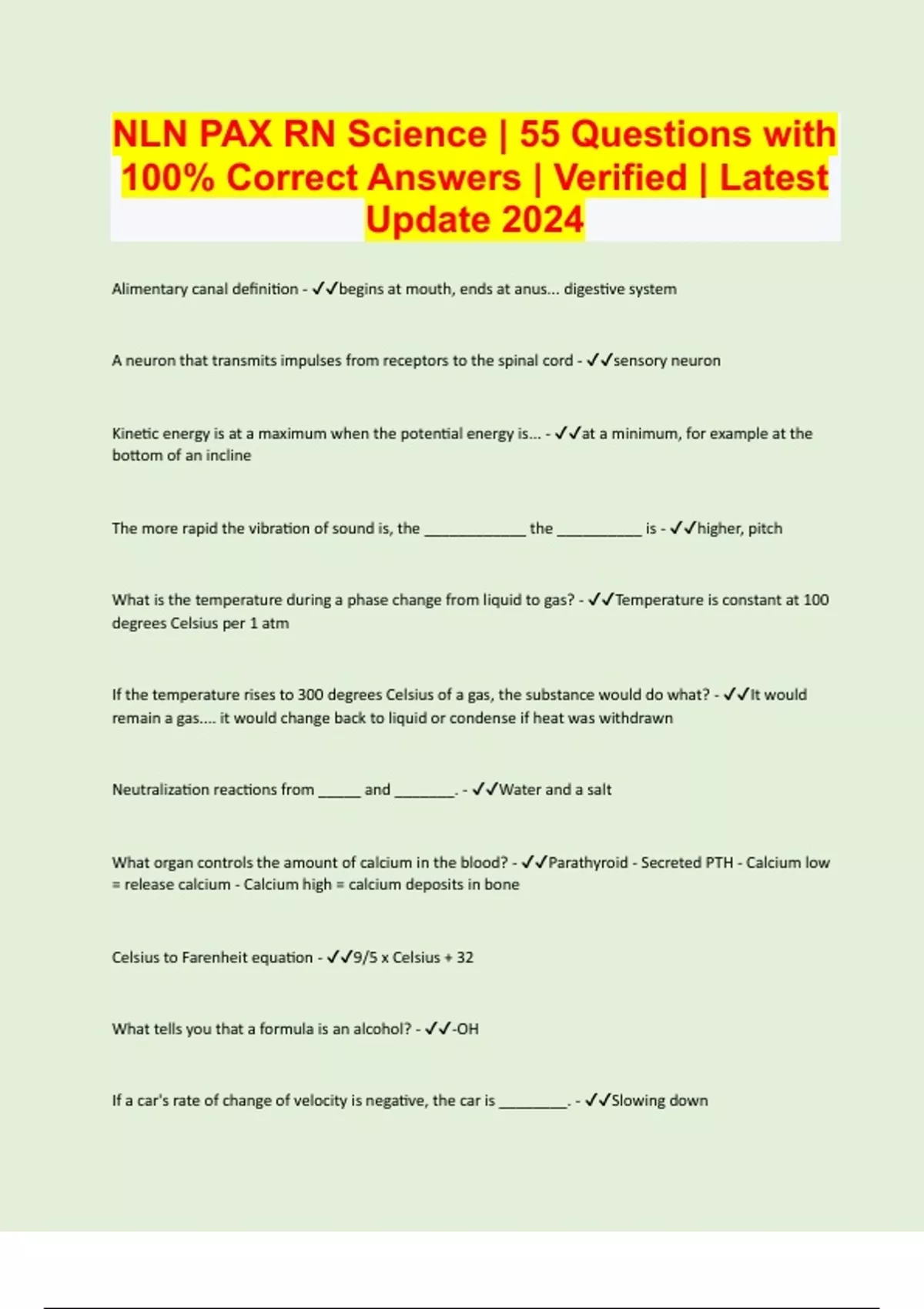 Alimentary canal definition - begins at mouth, ends at anus... digestive system A neuron that transmits impulses from receptors to the spinal cord - sensory neuron Kinetic energy is at a maximum when the potential energy is... - at a minimum, for example at the bottom of an incline The more rapid the vibration of sound is, the ____________ the __________ is - higher, pitch What is the temperature during a phase change from liquid to gas? - Temperature is constant at 100 degrees Celsius per 1 atm If the temperature rises to 300 degrees Celsius of a gas, the substance would do what? - It would remain a gas.... it would change back to liquid or condense if heat was withdrawn Neutralization reactions from _____ and _______. - Water and a salt What organ controls the amount of calcium in the blood? - Parathyroid - Secreted PTH - Calcium low = release calcium - Calcium high = calcium deposits in bone Celsius to Farenheit equation - 9/5 x Celsius + 32 What tells you that a formula is an alcohol? - -OH