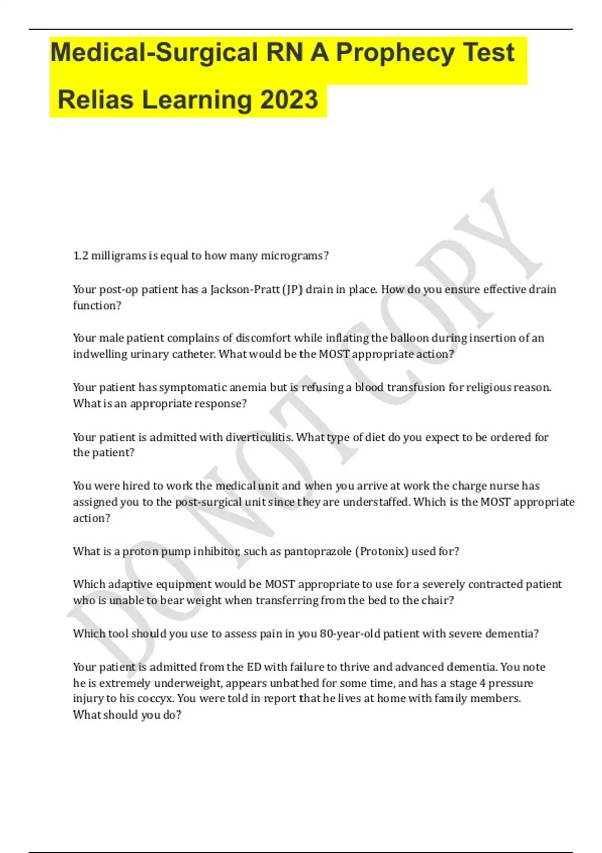 Medical-Surgical RN A Prophecy Test Relias Learning 2023 1.2 milligrams is equal to how many micrograms? Your post-op patient has a Jackson-Pratt (JP) drain in place. How do you ensure effective drain function? Your male patient complains of discomfort while inflating the balloon during insertion of an indwelling urinary catheter. What would be the MOST appropriate action? Your patient has symptomatic anemia but is refusing a blood transfusion for religious reason. What is an appropriate response? Your patient is admitted with diverticulitis. What type of diet do you expect to be ordered for the patient? You were hired to work the medical unit and when you arrive at work the charge nurse has assigned you to the post-surgical unit since they are understaffed. Which is the MOST appropriate action? What is a proton pump inhibitor, such as pantoprazole (Protonix) used for? Which adaptive equipment would be MOST appropriate to use for a severely contracted patient who is unable to bear weight when transferring from the bed to the chair? Which tool should you use to assess pain in you 80-year-old patient with severe dementia? Your patient is admitted from the ED with failure to thrive and advanced dementia. You note he is extremely underweight, appears unbathed for some time, and has a stage 4 pressure injury to his coccyx. You were told in report that he lives at home with family members. What should you do? Your 85-year-old patient with atrial fibrillation fell at home 3 days ago. You notice she has been having several episodes of acute confusion since being admitted to your unit. What is the MOST important order you should anticipate from the provider? Your patient has a temp of 102.3 F, HR 122, and has had 15 mL of urine from the indwelling urinary catheter in the last 2 hours. What is your patient MOST likely experiencing. What type of personal protective equipment (PPE) is applied prior to entering a room for a patient with C. diff? Your patient continues to pull at their IV site located in their left forearm despite verbal reminders and increased observation. The nursing assistant recommends using soft mitt restraints on the patient. What is your recommendation? Your patient was admitted for a hypertensive crisis and has a history of HTN, Parkinson's disease, depression, and alcohol use. On his second hospitalized day, you notice he is more anxious and restless than his baseline. What would be your FIRST nursing intervention? What is the BEST indication of an acute neurological problem? While in a supine position your patient states, "I'm tired and cannot catch my breath." Physical assessment reveals jugular vein distention and a third heart sound (S3). These symptoms are indicative of what condition? Your new admission presents with a cough, unintentional weight loss, frequent night sweats, and bloody sputum. What type of isolation precautions should you initiate, if any? Patients with diabetes are at high risk for complications from damage to what body areas? If your patient with a known history of diabetes is displaying symptoms of diaphoresis, cool skin, lethargy, and shakiness. What is your first action? Your patient tells you, "I hope I don't die, but if I do I don't want to be brought back.? You notice on her chart and wrist band that she is a full code. What would be the MOST appropriate action? Your coworker posted photos on social media from a birthday party they had for her in the unit breakroom. What should be your NEXT course of action