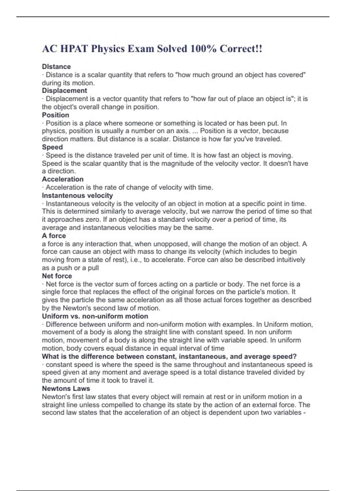 AC HPAT Physics Exam Solved 100% Correct!! DIstance · Distance is a scalar quantity that refers to "how much ground an object has covered" during its motion. Displacement · Displacement is a vector quantity that refers to "how far out of place an object is"; it is the object's overall change in position. Position · Position is a place where someone or something is located or has been put. In physics, position is usually a number on an axis. ... Position is a vector, because direction matters. But distance is a scalar. Distance is how far you've traveled. Speed · Speed is the distance traveled per unit of time. It is how fast an object is moving. Speed is the scalar quantity that is the magnitude of the velocity vector. It doesn't have a direction. Acceleration · Acceleration is the rate of change of velocity with time. Instantenous velocity · Instantaneous velocity is the velocity of an object in motion at a specific point in time. This is determined similarly to average velocity, but we narrow the period of time so that it approaches zero. If an object has a standard velocity over a period of time, its average and instantaneous velocities may be the same. A force a force is any interaction that, when unopposed, will change the motion of an object. A force can cause an object with mass to change its velocity (which includes to begin moving fro