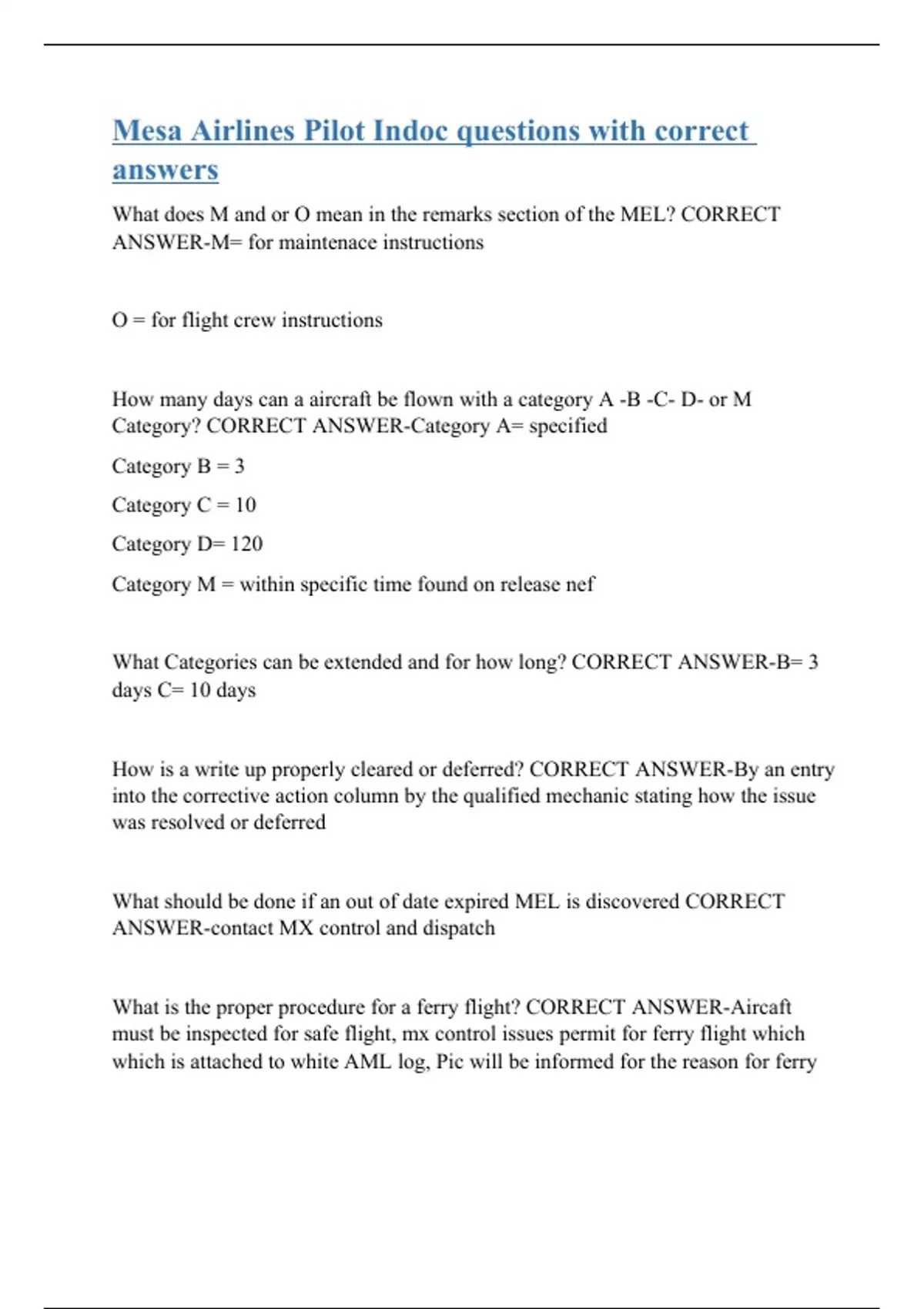 What does M and or O mean in the remarks section of the MEL? CORRECT ANSWER-M= for maintenace instructions O = for flight crew instructions How many days can a aircraft be flown with a category A -B -C- D- or M Category? CORRECT ANSWER-Category A= specified Category B = 3 Category C = 10 Category D= 120 Category M = within specific time found on release nef What Categories can be extended and for how long? CORRECT ANSWER-B= 3 days C= 10 days How is a write up properly cleared or deferred? CORRECT ANSWER-By an entry into the corrective action column by the qualified mechanic stating how the issue was resolved or deferred What should be done if an out of date expired MEL is discovered CORRECT ANSWER-contact MX control and dispatch