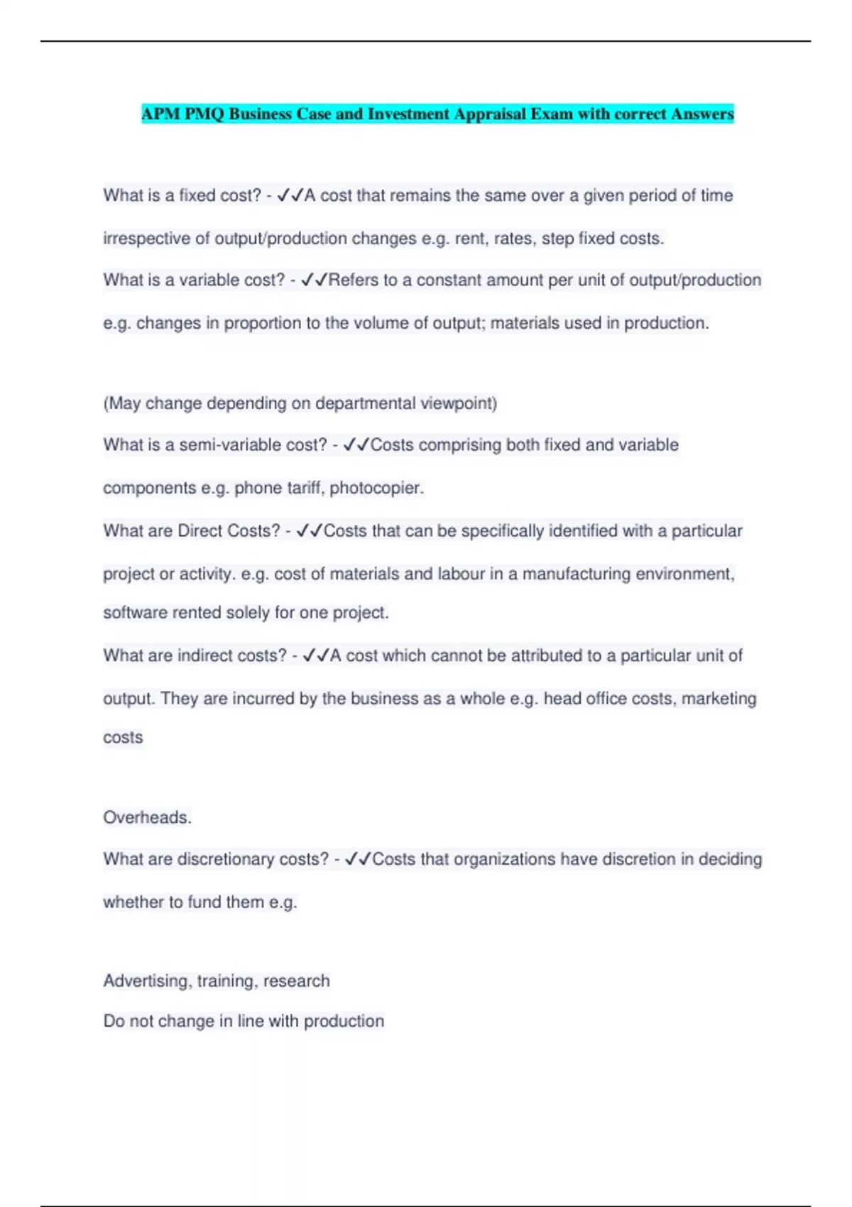 APM PMQ Business Case and Investment Appraisal Exam with correct Answers What is a fixed cost? - ️️ A cost that remains the same over a given period of time irrespective of output/production changes e.g. rent, rates, step fixed costs. What is a variable cost? - ️️ Refers to a constant amount per unit of output/production e.g. changes in proportion to the volume of output; materials used in production. (May change depending on departmental viewpoint) What is a semi-variable cost? - ️️ Costs comprising both fixed and variable components e.g. phone tariff, photocopier. What are Direct Costs? - ️️ Costs that can be specifically identified with a particular project or activity. e.g. cost of materials and labour in a manufacturing environment, software rented solely for one project. What are indirect costs? - ️️ A cost which cannot be attributed to a particular unit of output. They are incurred by the business as a whole e.g. head office costs, marketing costs Overheads. What are discretionary costs? - ️️ Costs that organizations have discretion in deciding whether to fund them e.g. Advertising, training, resea