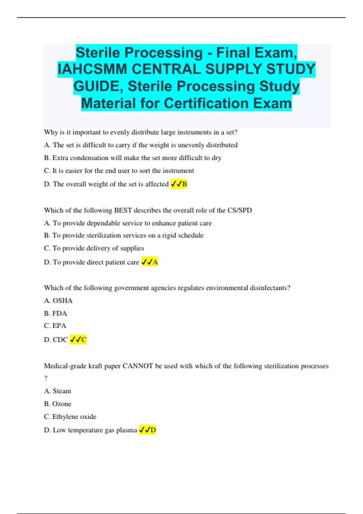 Sterile Processing - Final Exam, IAHCSMM CENTRAL SUPPLY STUDY GUIDE, Sterile Processing Study Material for Certification Exam
