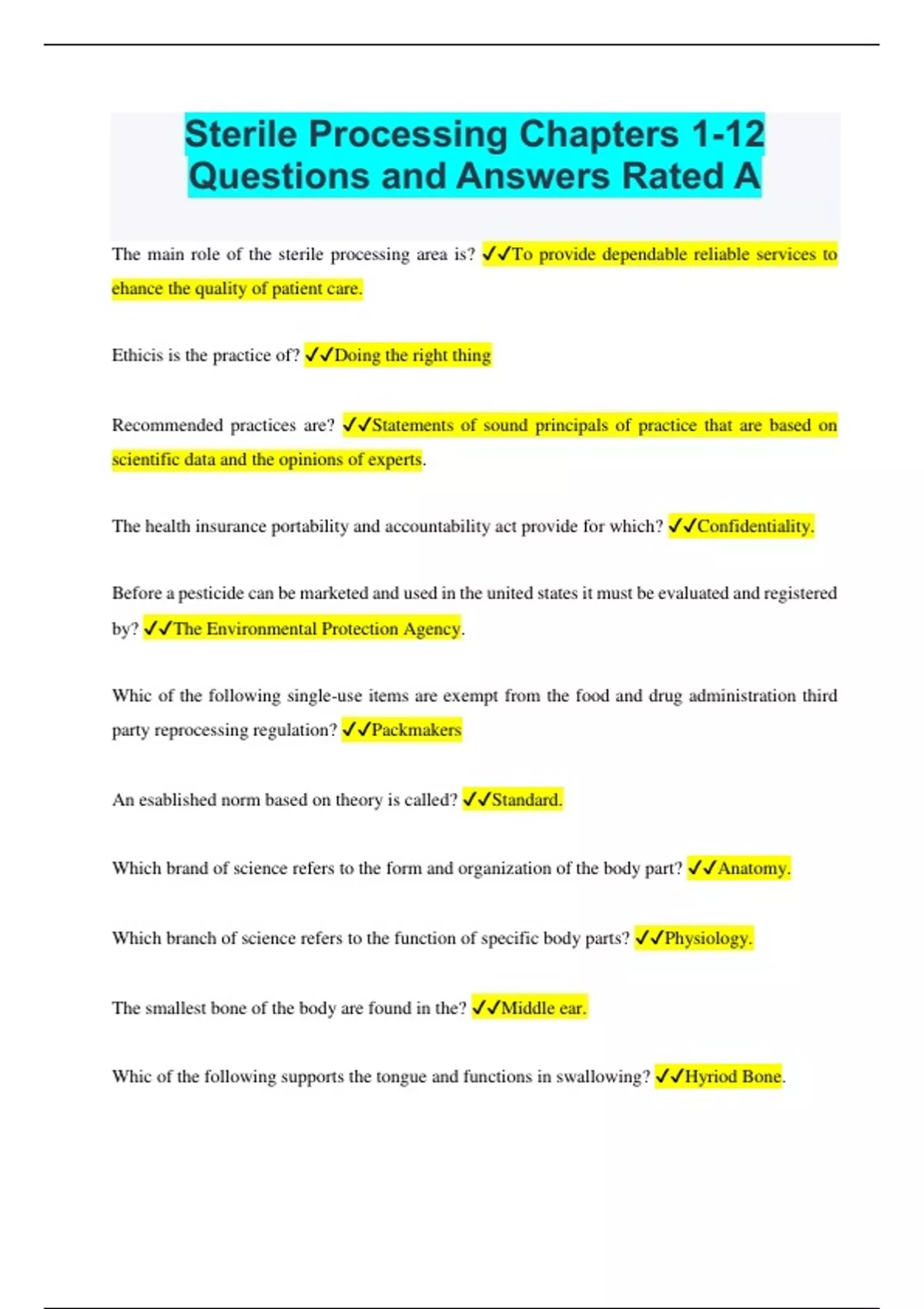 Sterile Processing Chapters 1-12 Questions and Answers Rated A The main role of the sterile processing area is? To provide dependable reliable services to ehance the quality of patient care. Ethicis is the practice of? Doing the right thing Recommended practices are? Statements of sound principals of practice that are based on scientific data and the opinions of experts. The health insurance portability and accountability act provide for which? Confidentiality. Before a pesticide can be marketed and used in the united states it must be evaluated and registered by? The Environmental Protection Agency. Whic of the following single-use items are exempt from the food and drug administration third party reprocessing regulation? Packmakers An esablished norm based on theory is called? Standard. Which brand of science refers to the form and organization of the body part? Anatomy. Which branch of science refers to the function of specific body parts? Physiology. The smallest bone of the body are found in the? Middle ear. Whic of the following supports the tongue and functions in swallowing? Hyriod Bone.