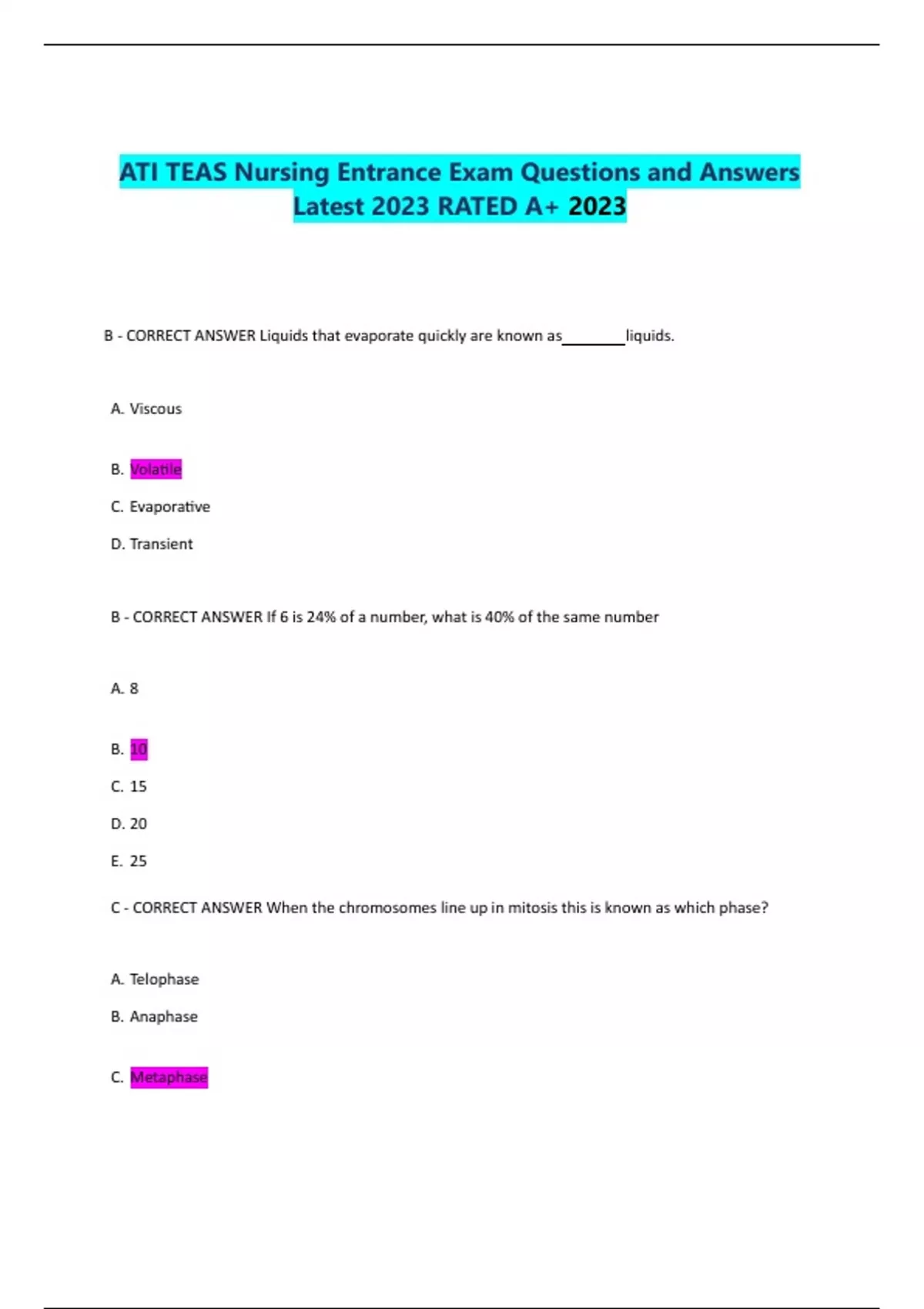 B - CORRECT ANSWER Liquids that evaporate quickly are known as liquids. A. Viscous B. Volatile C. Evaporative D. Transient B - CORRECT ANSWER If 6 is 24% of a number, what is 40% of the same number A. 8 B. 10 C. 15 D. 20 E. 25 C - CORRECT ANSWER When the chromosomes line up in mitosis this is known as which phase? A. Telophase B. Anaphase C. Metaphase