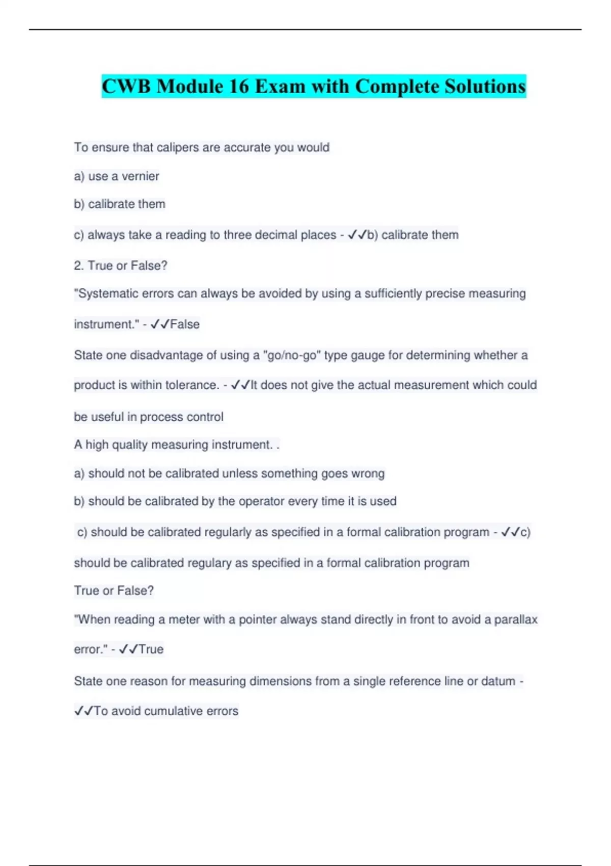 CWB Module 16 Exam with Complete Solutions To ensure that calipers are accurate you would a) use a vernier b) calibrate them c) always take a reading to three decimal places - ️️ b) calibrate them 2. True or False? "Systematic errors can always be avoided by using a sufficiently precise measuring instrument." - ️️ False State one disadvantage of using a "go/no-go" type gauge for determining whether a product is within tolerance. - ️️ It does not give the actual measurement which could be useful in process control A high quality measuring instrument. . a) should not be calibrated unless something goes wrong b) should be calibrated by the operator every time it is used c) should be calibrated regularly as specified in a formal calibration program - ️️ c) should be calibrated regulary as specified in a formal calibration program True or False? "When reading a meter with a pointer always stand directly in front to avoid a parallax error." - ️️ True State one reason for measuring dimensions from a single reference line or datum - ️️ To avoid cumulative error