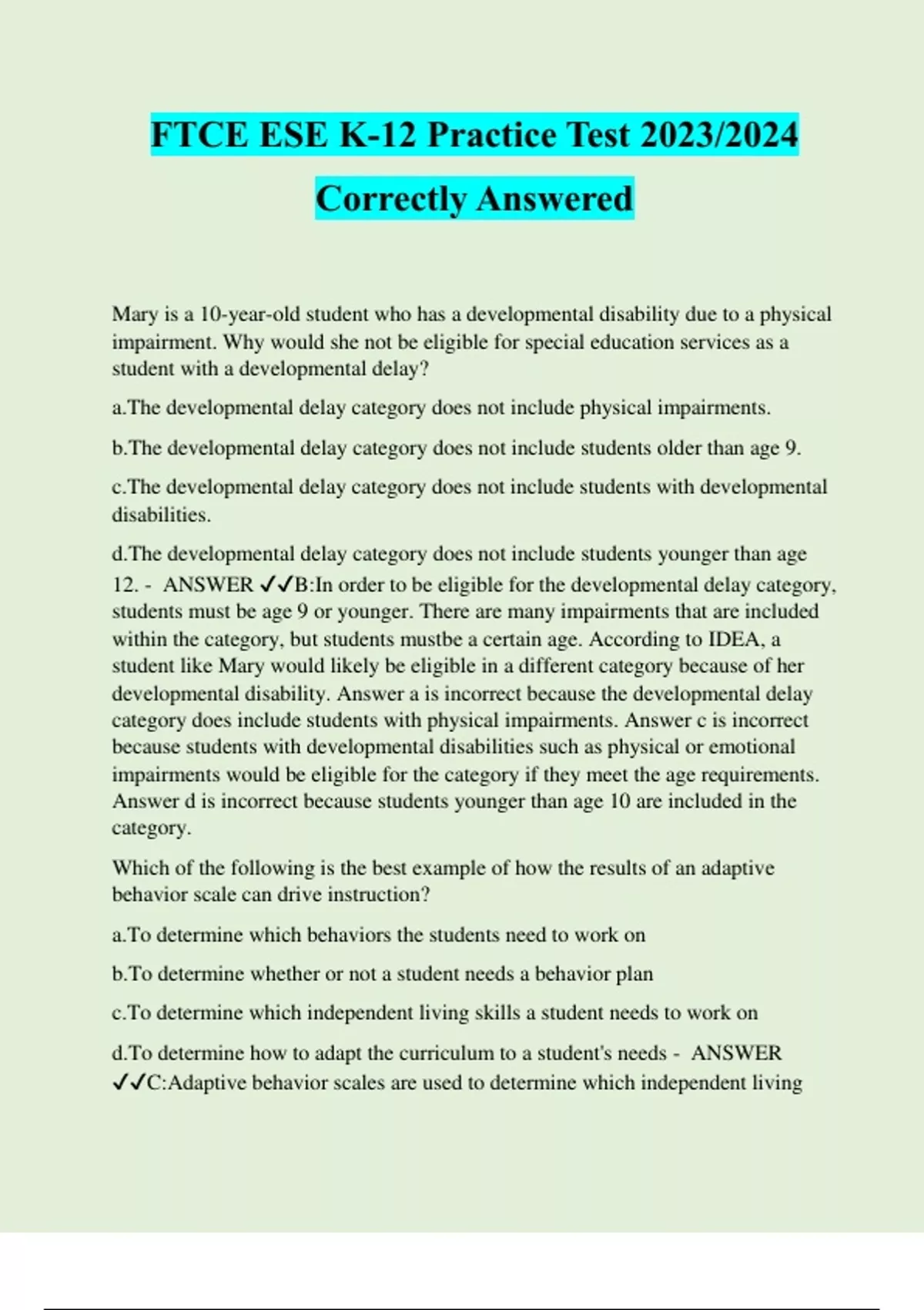 FTCE ESE K-12 Practice Test 2023/2024 Correctly Answered Mary is a 10-year-old student who has a developmental disability due to a physical impairment. Why would she not be eligible for special education services as a student with a developmental delay? a.The developmental delay category does not include physical impairments. b.The developmental delay category does not include students older than age 9. c.The developmental delay category does not include students with developmental disabilities. d.The developmental delay category does not include students younger than age 12. - ANSWER ️️ B:In order to be eligible for the developmental delay category, students must be age 9 or younger. There are many impairments that are included within the category, but students mustbe a certain age. According to IDEA, a student like Mary would likely be eligible in a different category because of her developmental disability. Answer a is incorrect because the developmental delay category does include students with physical impairments. Answer c is incorrect because students with developmental disabilities such as physical or emotional impairments would be eligible for the category if they meet the age requirements. Answer d is incorrect because students younger than age 10 are included in the category. Which of the following is the best example of how the results of an adaptive behavior scale can drive instruction? a.To determine which behaviors the students need to work on b.To determine whether or not a student needs a behavior plan c.To determine which independent living skills a student needs to work on d.To determine how to adapt the curriculum to a student's needs - ANSWER ️️ C:Adaptive behavior scales are used to determine which independent living