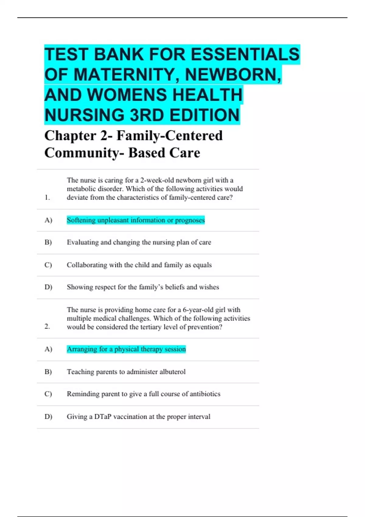 TEST BANK FOR ESSENTIALS OF MATERNITY, NEWBORN, AND WOMENS HEALTH NURSING 3RD EDITION Chapter 2- Family-Centered Community- Based Care 1. The nurse is caring for a 2-week-old newborn girl with a metabolic disorder. Which of the following activities would deviate from the characteristics of family-centered care? A) Softening unpleasant information or prognoses B) Evaluating and changing the nursing plan of care C) Collaborating with the child and family as equals D) Showing respect for the family’s beliefs and wishes 2. The nurse is providing home care for a 6-year-old girl with multiple medical challenges. Which of the following activities would be considered the tertiary level of prevention? A) Arranging for a physical therapy session B) Teaching parents to administer albuterol C) Reminding parent to give a full course of antibiotics D) Giving a DTaP vaccination at the proper interval 3. A nursing student is reviewing information about documenting client care and education in the medical record and the purposes that it serves. The student demonstrates a need for additional study when the nurse identifies which of the following as a reason? A) Serves as a communication tool for the interdisciplinary team.