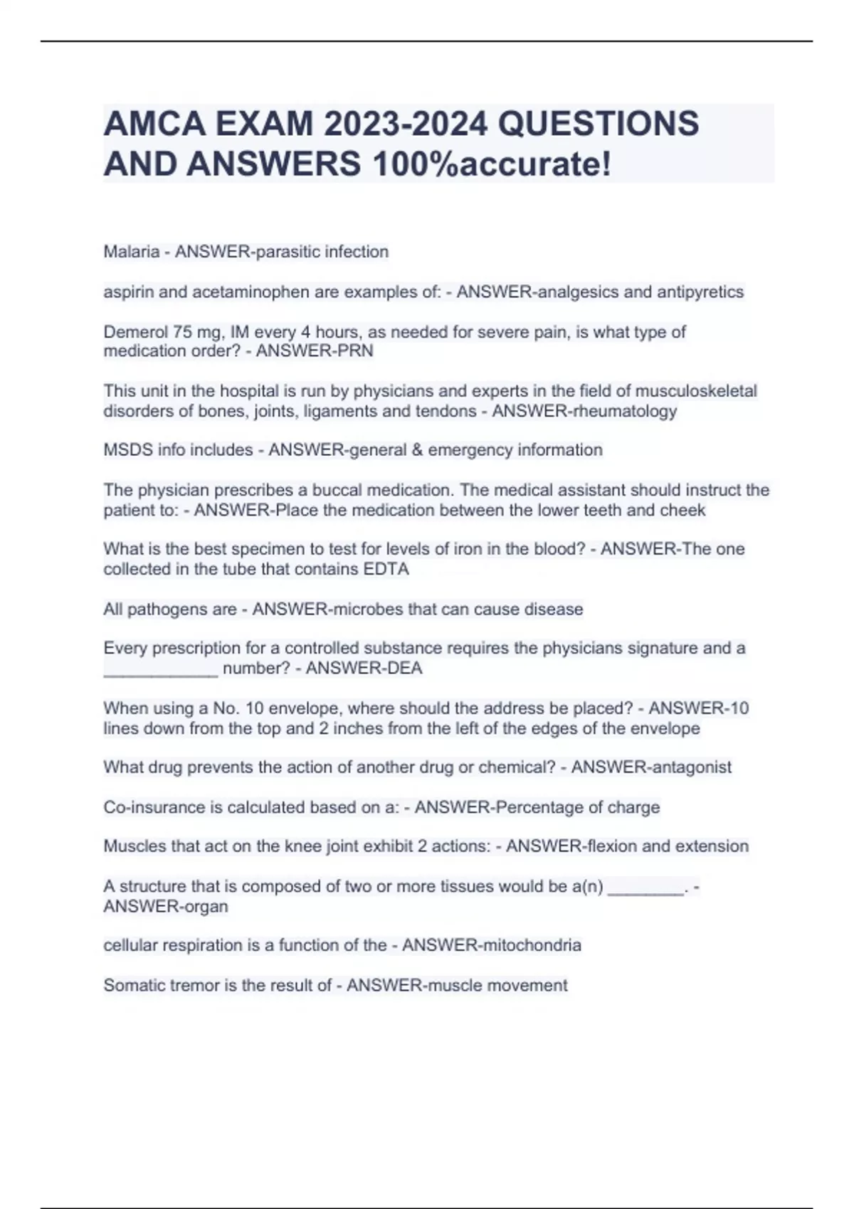 AMCA EXAM QUESTIONS AND ANSWERS 100%accurate! AMCA EXAM QUESTIONS AND ANSWERS 100%accurate! AMCA EXAM QUESTIONS AND ANSWERS 100%accurate! Malaria - ANSWER-parasitic infection aspirin and acetaminophen are examples of: - ANSWER-analgesics and antipyretics Demerol 75 mg, IM every 4 hours, as needed for severe pain, is what type of medication order? - ANSWER-PRN This unit in the hospital is run by physicians and experts in the field of musculoskeletal disorders of bones, joints, ligaments and tendons - ANSWER-rheumatology MSDS info includes - ANSWER-general & emergency information The physician prescribes a buccal medication. The medical assistant should instruct the patient to: - ANSWER-Place the medication between the lower teeth and cheek What is the best specimen to test for levels of iron in the blood? - ANSWER-The one collected in the tube that contains EDTA All pathogens are - ANSWER-microbes that can cause disease Every prescription for a controlled substance requires the physicians signature and a ____________ number? - ANSWER-DEA When using a No. 10 envelope, where should the address be placed? - ANSWER-10 lines down from the top and 2 inches from the left of the edges of the envelope What drug prevents the action of another drug or chemical? - ANSWER-antagonist Co-insurance is calculated based on a: - ANSWER-Percentage of charge Muscles that act on the knee joint exhibit 2 actions: - ANSWER-flexion and extension