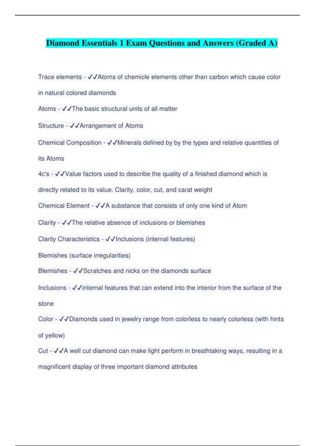 Diamond Essentials 1 Exam Questions and Answers (Graded A) Trace elements - ️️ Atoms of chemicle elements other than carbon which cause color in natural colored diamonds Atoms - ️️ The basic structural units of all matter Structure - ️️ Arrangement of Atoms Chemical Composition - ️️ Minerals defined by by the types and relative quantities of its Atoms 4c's - ️️ Value factors used to describe the quality of a finished diamond which is directly related to its value. Clarity, color, cut, and carat weight Chemical Element - ️️ A substance that consists of only one kind of Atom Clarity - ️️ The relative absence of inclusions or blemishes