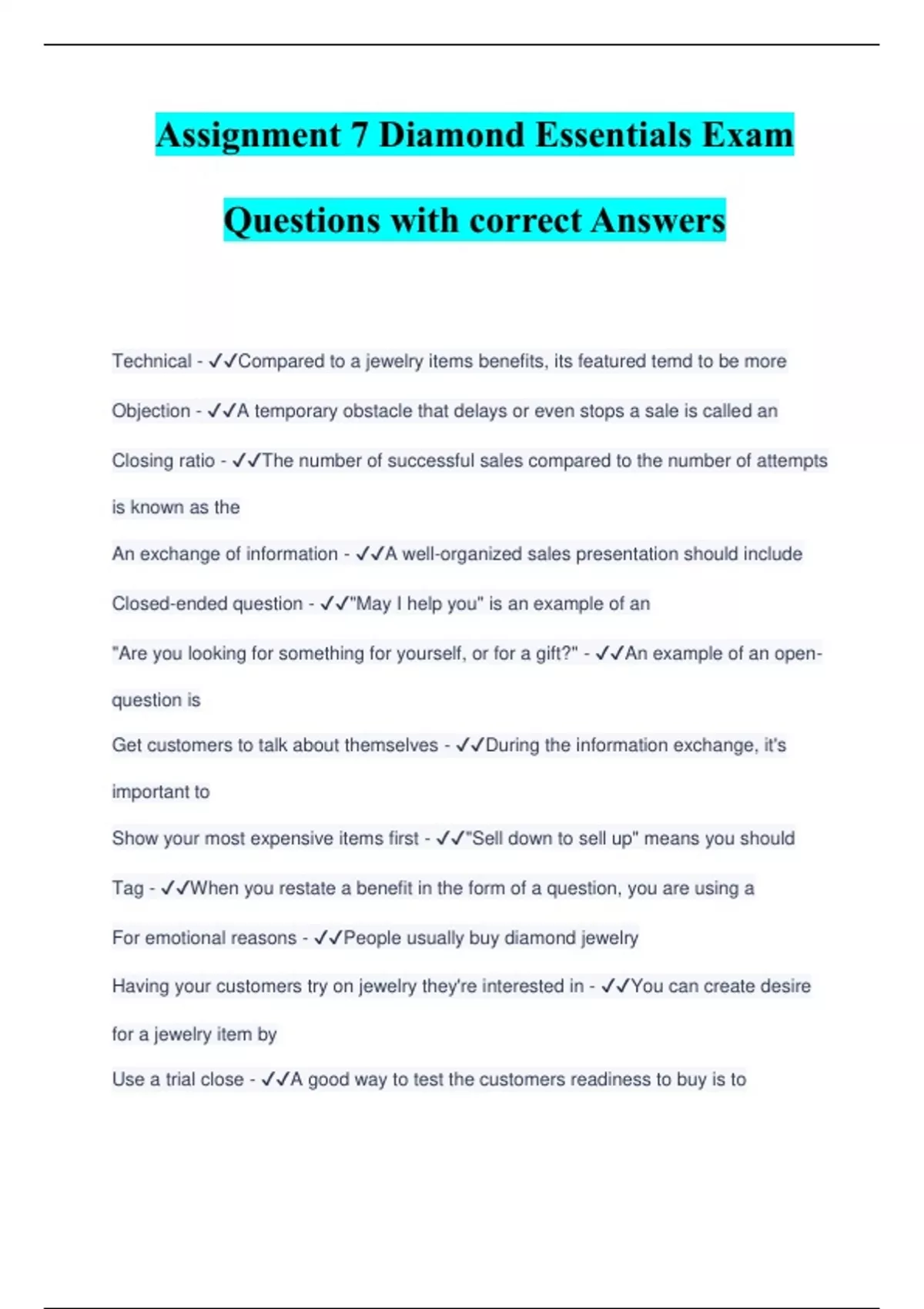 Assignment 7 Diamond Essentials Exam Questions with correct Answers Technical - ️️ Compared to a jewelry items benefits, its featured temd to be more Objection - ️️ A temporary obstacle that delays or even stops a sale is called an Closing ratio - ️️ The number of successful sales compared to the number of attempts is known as the An exchange of information - ️️ A well-organized sales presentation should include Closed-ended question - ️️ "May I help you" is an example of an "Are you looking for something for yourself, or for a gift?" - ️️ An example of an ope