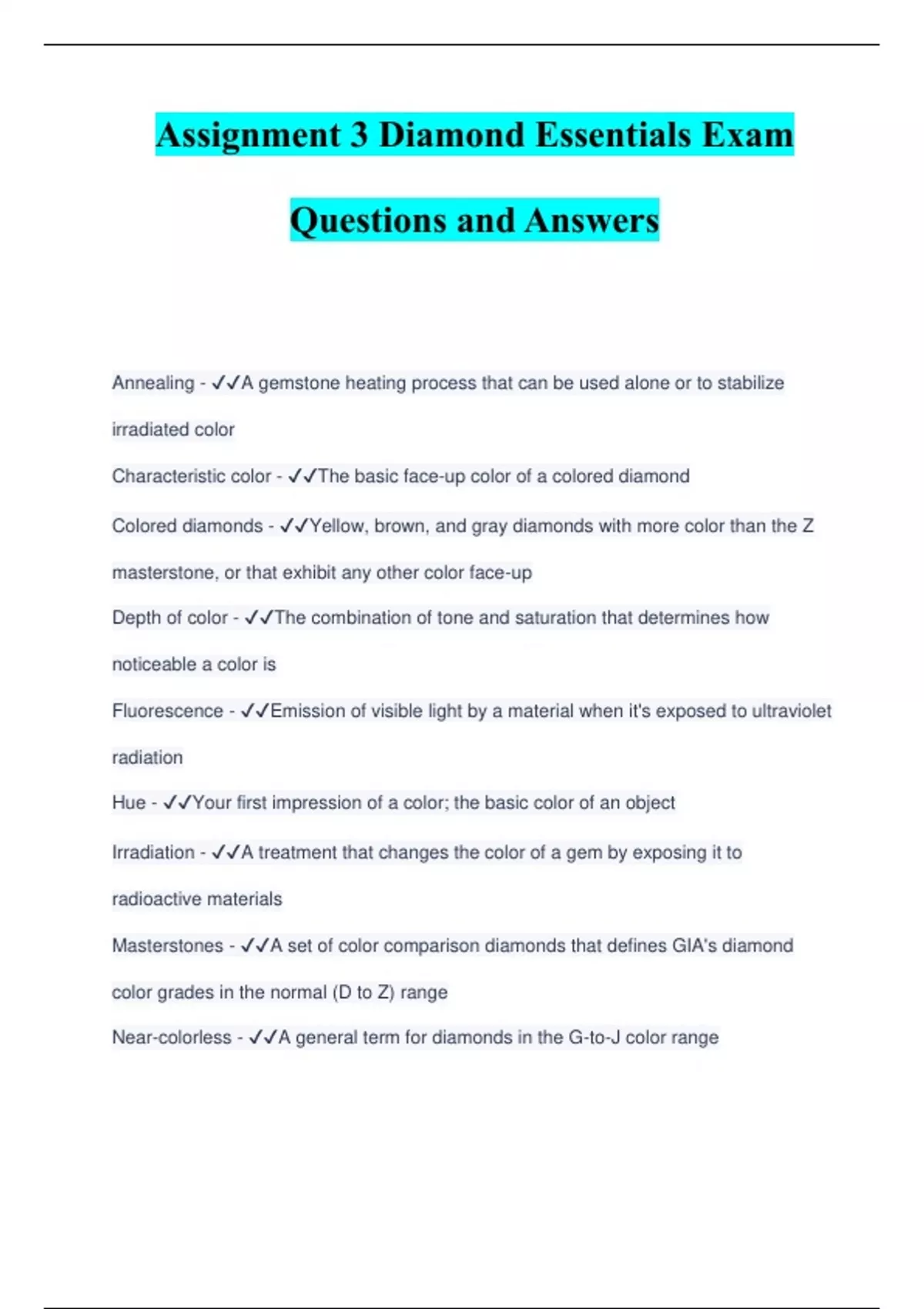 Assignment 3 Diamond Essentials Exam Questions and Answers Annealing - ️️ A gemstone heating process that can be used alone or to stabilize irradiated color Characteristic color - ️️ The basic face-up color of a colored diamond Colored diamonds - ️️ Yellow, brown, and gray diamonds with more color than the Z masterstone, or that exhibit any other color face-up Depth of color - ️️ The combination of tone and saturation that determines how noticeable a color is Fluorescence - ️️ Emission of visible light by a material when it's exposed to ultraviolet radiation Hue - ️️ Your first impression of a color; the basic color of an object
