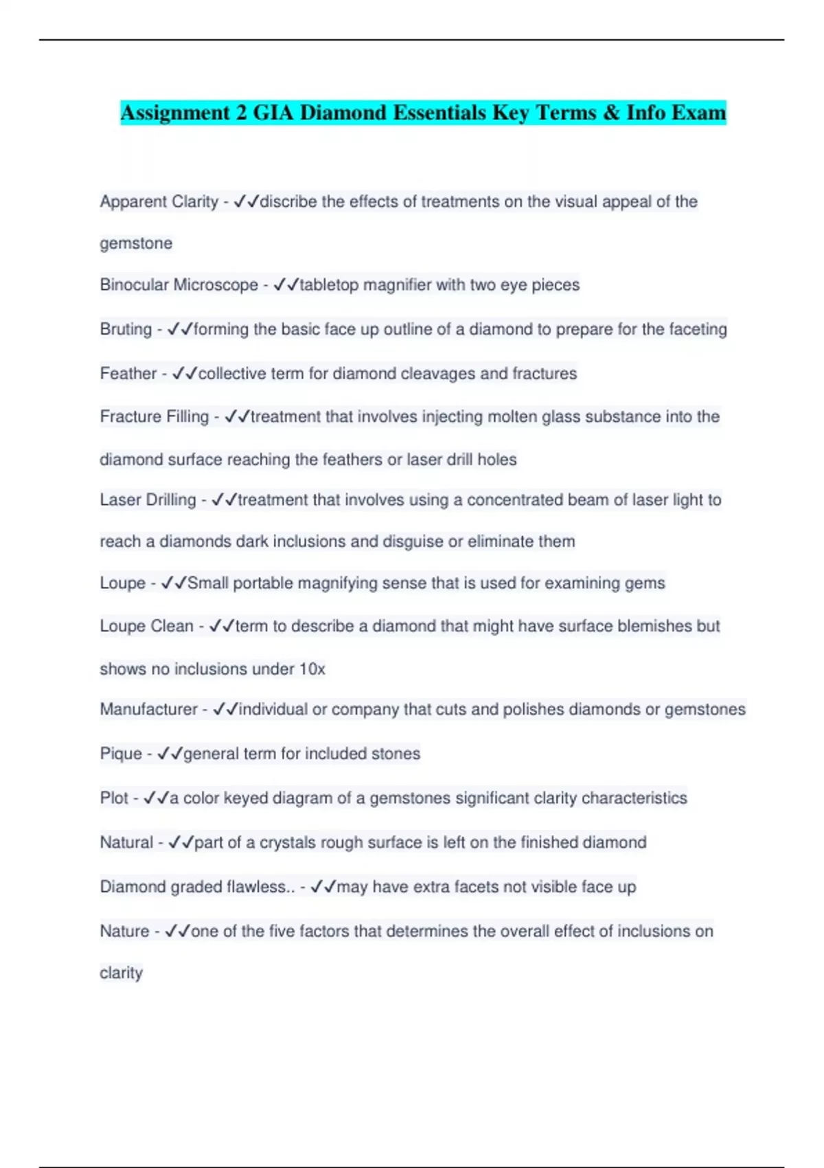ssignment 2 GIA Diamond Essentials Key Terms & Info Exam Apparent Clarity - ️️ discribe the effects of treatments on the visual appeal of the gemstone Binocular Microscope - ️️ tabletop magnifier with two eye pieces Bruting - ️️ forming the basic face up outline of a diamond to prepare for the faceting Feather - ️️ collective term for diamond cleavages and fractures Fracture Filling - ️️ treatment that involves injecting molten glass substance into the diamond surface reaching the feathers or laser drill holes Laser Drilling - ️️ treatment that involves using a concentrated beam of laser