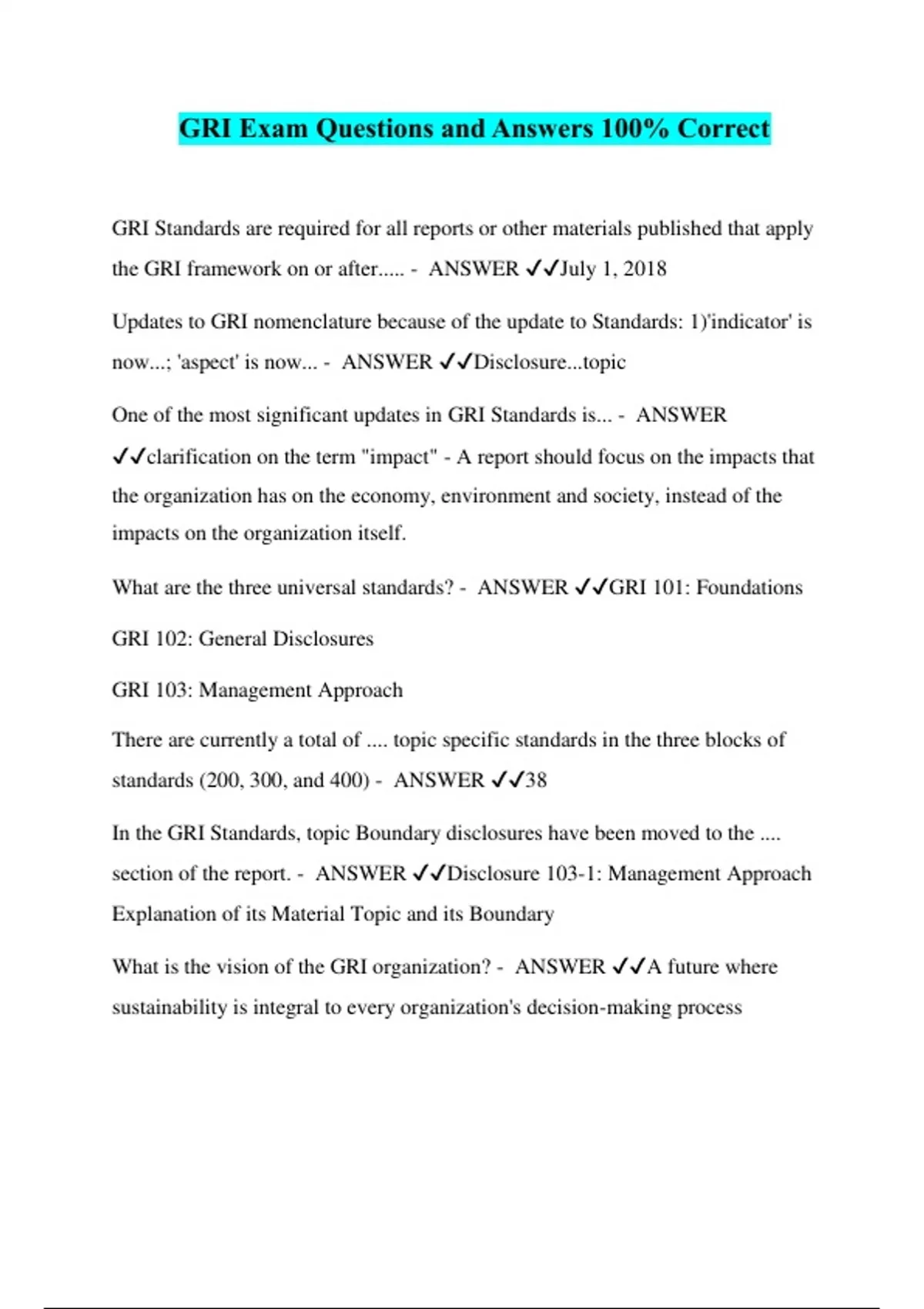 GRI Exam Questions and Answers 100% Correct GRI Standards are required for all reports or other materials published that apply the GRI framework on or after..... - ANSWER ️️ July 1, 2018 Updates to GRI nomenclature because of the update to Standards: 1)'indicator' is now...; 'aspect' is now... - ANSWER ️️ Disclosure...topic One of the most significant updates in GRI Standards is... - ANSWER ️️ clarification on the term "impact" - A report should focus on the impacts that the organization has on the economy, environment and society, instead of the impacts on the organization itself. What are the three universal standards? - ANSWER ️️ GRI 101: Foundations GRI 102: General Disclosures GRI 103: Management Approach There are currently a total of .... topic specific standards in the three blocks of standards (200, 300, and 400) - ANSWER ️️ 38 In the GRI Standards, topic Boundary disclosures have been moved to the .... section of the report. - ANSWER ️️ Disclosure 103-1: Management Approach Explanation of its Material Topic and its Boundary